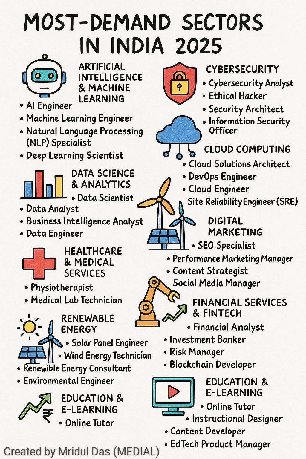 Most in-demand sectors job in India 2025. Now these jobs are booming 🔥 🔸 Artificial Intelligence & Machine Learning 🔹AI Engineer 🔹Machine Learning Engineer 🔹Natural Language Processing (NLP) Specialist 🔹Deep Learning Scientist 🔸Data Science & Analytics 🔹Data Scientist 🔹Data Analyst 🔹Business Intelligence Analyst 🔹Data Engineer 🔸 Cybersecurity 🔹Cybersecurity Analyst Ethical Hacker 🔹Security Architect 🔹Information Security Officer 🔸 Cloud Computing 🔹Cloud Solutions Architect 🔹DevOps Engineer 🔹Cloud Engineer 🔹Site Reliability Engineer (SRE) 🔸 Digital Marketing 🔹SEO Specialist 🔹Performance Marketing Manager 🔹Content Strategist 🔹Social Media Manager 🔸Healthcare & Medical Services 🔹Physiotherapist 🔹Medical Lab Technician 🔸 Renewable Energy 🔹Solar Panel Engineer 🔹Wind Energy Technician 🔹Renewable Energy Consultant 🔹Environmental Engineer 🔸Robotics & Automation 🔹Robotics Engineer 🔹Automation Test Engineer 🔹Control Systems Engineer 🔹Mechatronics Engineer 🔸Financial Services & FinTech 🔹Financial Analyst 🔹Investment Banker 🔹Risk Manager 🔹Blockchain Developer 🔸Education & E-Learning💻 🔹Online Tutor 🔹Instructional Designer 🔹Content Developer 🔹EdTech Product Manager