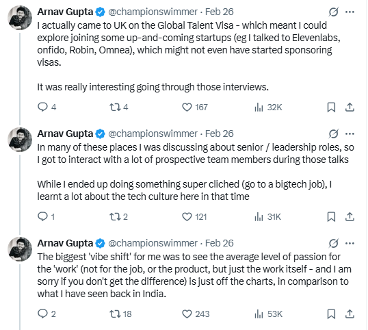 Bengaluru techie compares work culture in India and the UK after moving to London Six months after shifting his primary residence from Bengaluru to London, a techie detailed his experience in a lengthy thread on X as he listed the key differences be