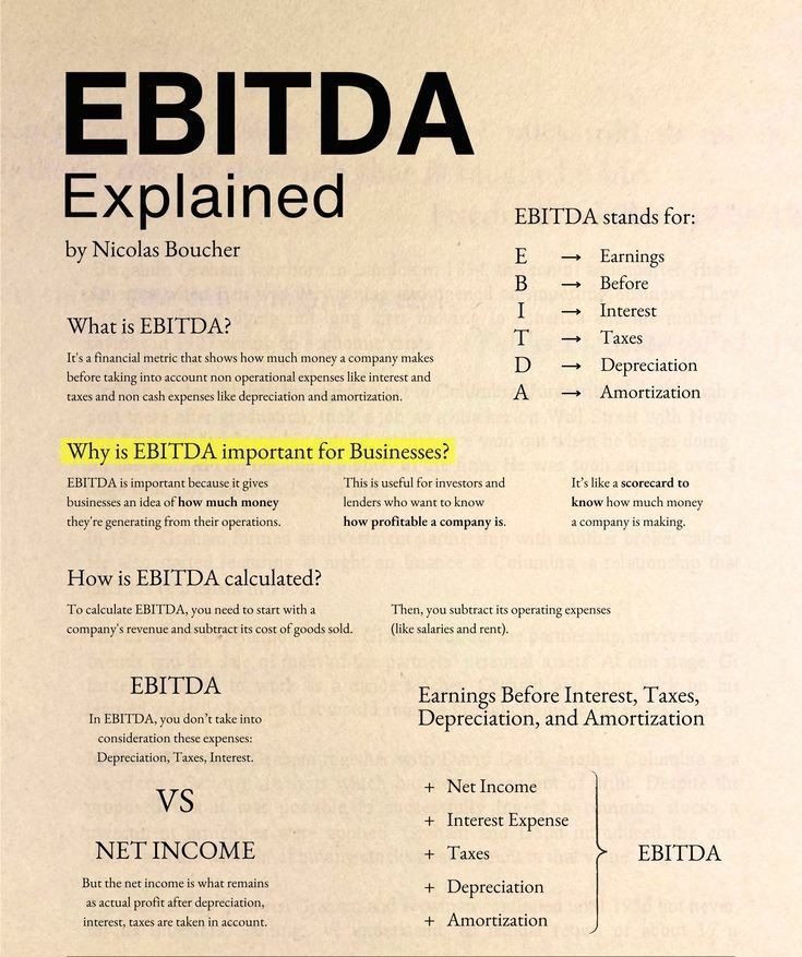 📢 WTF is EBITDA ❓🤔 EBITDA stands for Earnings Before Interest, Taxes, Depreciation, and Amortization ( Amortization in simple words is like repayment of installment/loans). It’s like looking at how much money a company makes from its core busine
