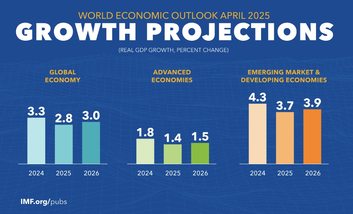 April 2025 IMF Outlook Dropped! In its April 2025 update, the IMF projects global GDP growth to ease to 2.8% in 2025 from 3.3% in 2024, before picking up to 3.0% in 2026. Advanced economies are expected to remain subdued, growing at just 1.4% in 2025, while emerging markets and developing economies are forecasted to maintain momentum, rebounding to 3.9% growth in 2026.