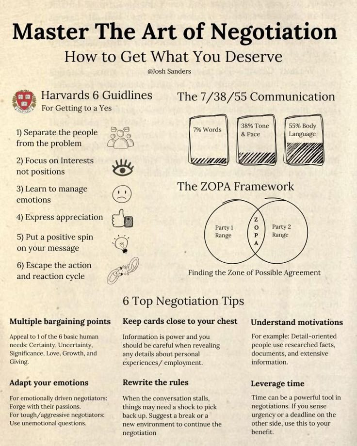Harvard's 6 Guidelines for Getting to a Yes: 1. Separate the people from the problem 2. Focus on interests, not positions 3. Learn to manage emotions 4. Express appreciation 5. Put a positive spin on your message 6. Escape the action and reaction cycle The 7/38/55 Communication Rule: 7% Words 38% Tone & Pace 55% Body Language The ZOPA Framework: ZOPA = Zone of Possible Agreement It’s the overlapping range where both parties’ interests meet. 6 Top Negotiation Tips: Multiple bargaining points: Appeal to basic human needs (certainty, love, growth, etc.) Keep cards close to your chest: Be cautious about revealing personal information. Understand motivations: Tailor your approach based on whether the other party is detail-oriented or emotional. Adapt your emotions: Manage your emotional approach based on the opponent’s style. Rewrite the rules: If negotiations stall, suggest a break or a change of setting. Leverage time: Use time pressure to your advantage.