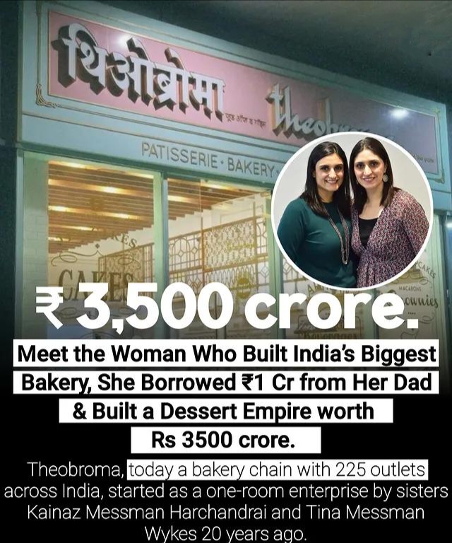 Theobroma is valued at โน3,500 Cr. โข Founded by sisters Kainaz Messman Harchandrai and Tina Messman Wykes. โข Started as a small bakery in Colaba, Mumbai, in 2004. โข Known for brownies, cakes, and desserts. โข Has grown to 225 outlets across India.