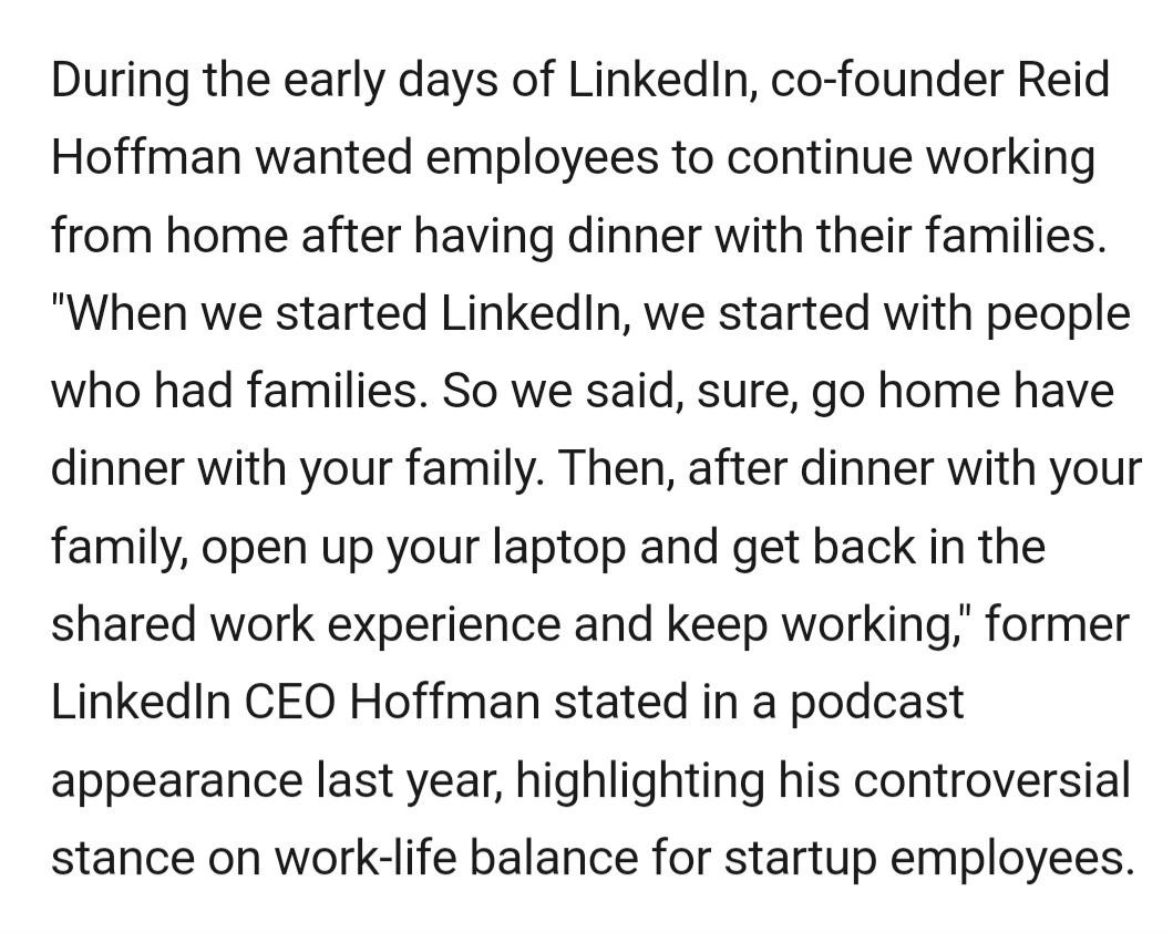"LinkedIn: Where Family Dinner Is Just Intermission Before Round Two of Work" Ah yes, the classic "have your cake and code it too" philosophy. Reid Hoffman's idea sounds like a warm hug followed by a polite shove back into the grind. “Go home, enjoy dinner… then fire up that laptop, champ!” It’s like telling someone, “Take a break—but only the kind that comes with a side of emails.” Honestly, it walks the line between supportive and burnout-on-the-rocks. Noble intent? Maybe. Sustainable? Only if your caffeine tolerance is elite.