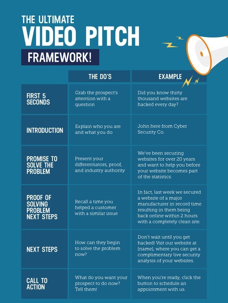 "The Ultimate Video Pitch Framework!". 1. First 5 Seconds Do: Grab the prospect’s attention with a question. Example:Did you know thirty thousand websites are hacked every day? 2. Introduction Do: Explain who you are and what you do. 3. Promise to Solve the Problem Do: Present your differentiators, proof, and industry authority. Example: We’ve been securing websites for over 20 years and want to help you before your website becomes part of the statistics. 4. Proof of Solving Problem Do: Recall a time you helped a customer with a similar issue. Example: Last week we secured a major manufacturer’s website in record time, bringing them back online within 2 hours with a clean site. 5. Next Steps Do: Tell them how they can begin solving the problem now. Example: Visit our website for a complimentary live security analysis 6. Call to Action Do: Clearly tell the prospect what to do next. Example: When you're ready, click the button to schedule an appointment with us.