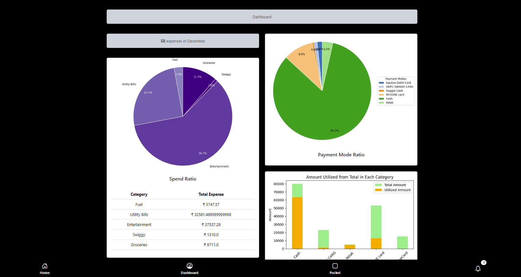 58 expenses added so far in current Month! This is how your Dashboard would look like, and give you visual insights on your spends. Wish I could take a snip of the entire Dashboard. There are few more parameters and visuals that help you track your