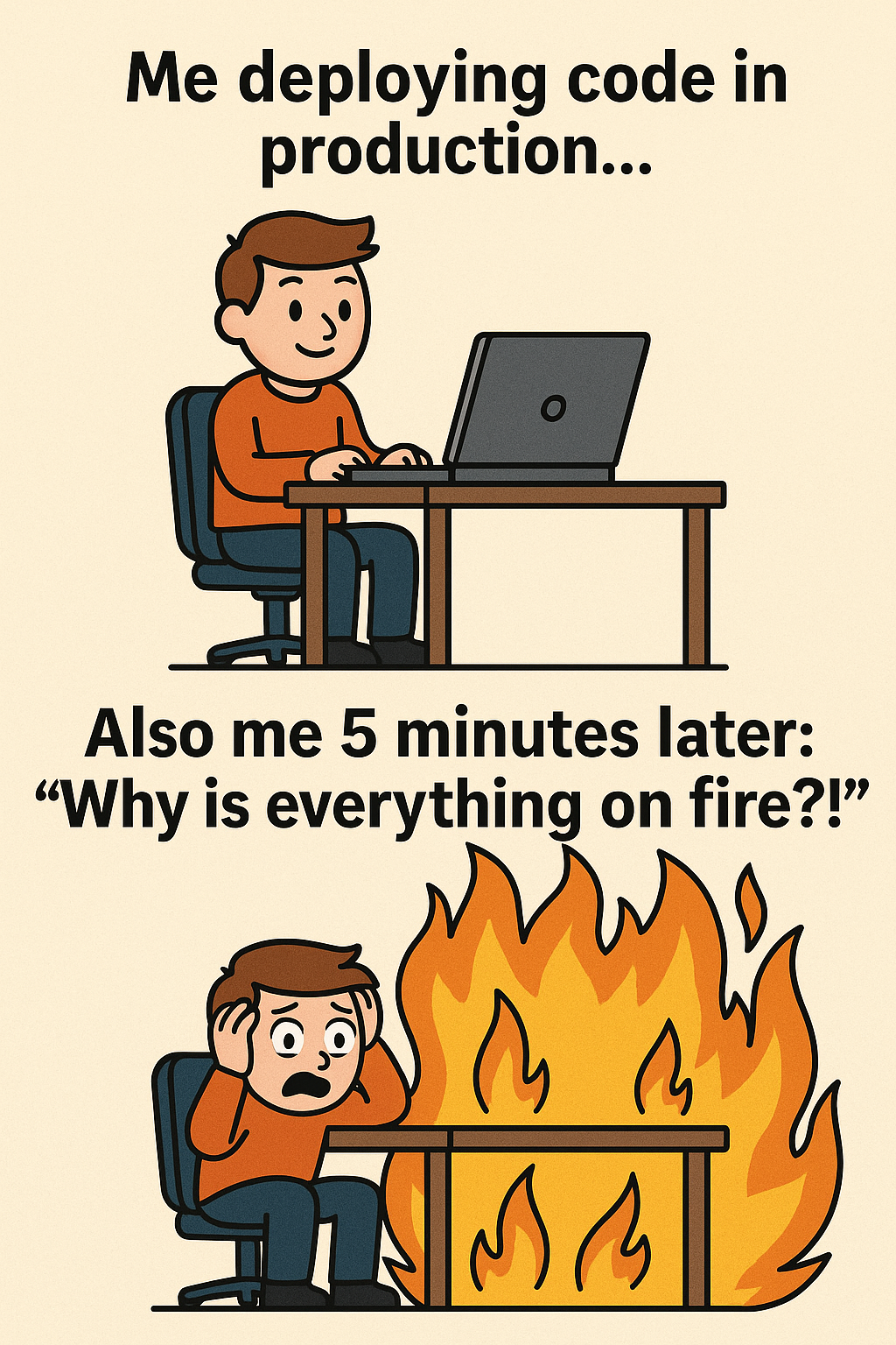 Deployed to production... and accidentally deployed chaos too." Hashtags: #DeveloperLife #CodeAndChaos #ProductionGoneWrong #TechFails #DebuggingInProgress #SendHelp