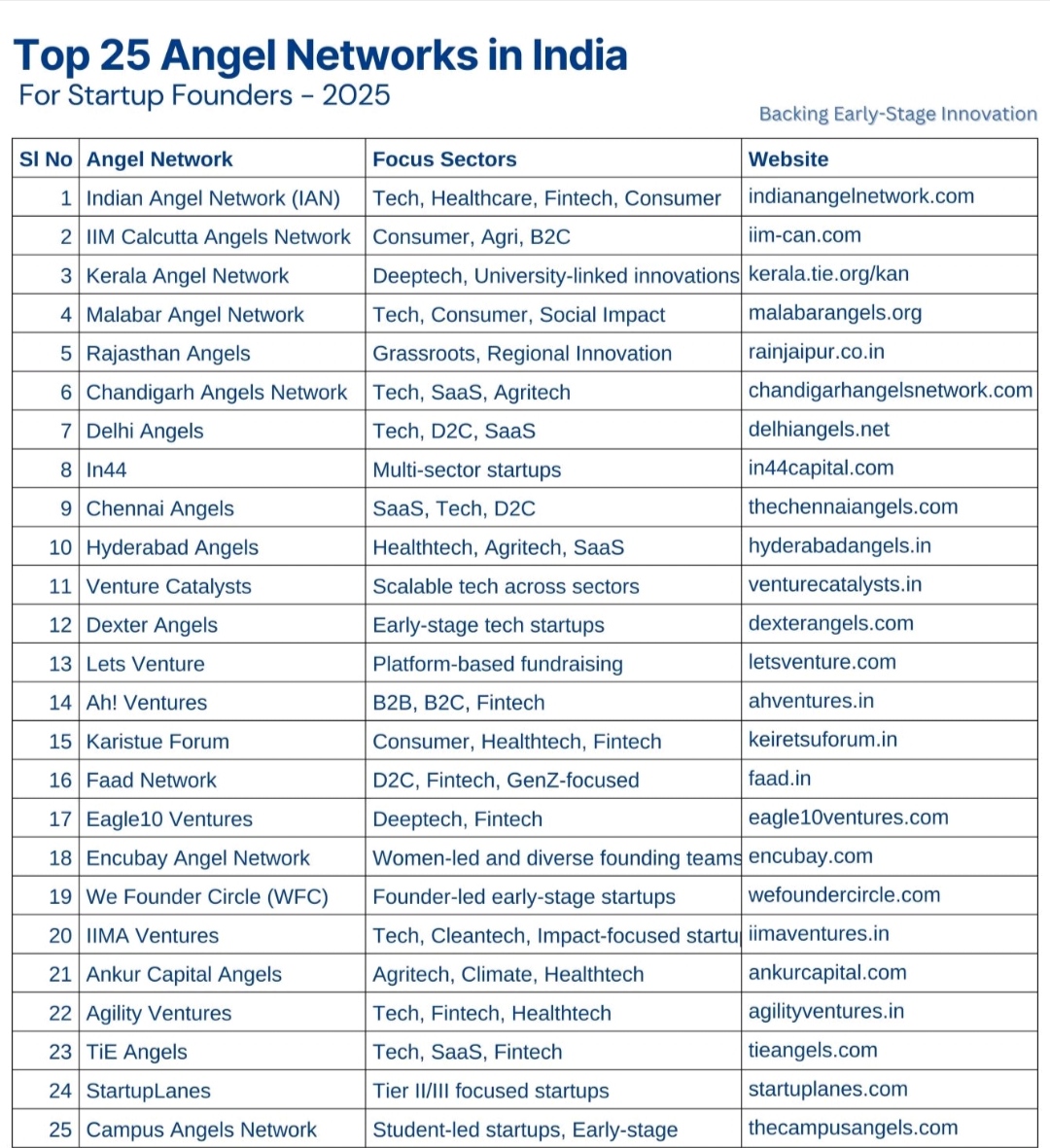 12 Angel Networks Active in India 1. Indian Angel Network (IAN) https://www.indianangelnetwork.com/ 2. Mumbai Angels Network https://www.mumbaiangels.com/ 3. Chennai Angels https://www.thechennaiangels.com/ 4. Lead Angels https://www.leadangels.i