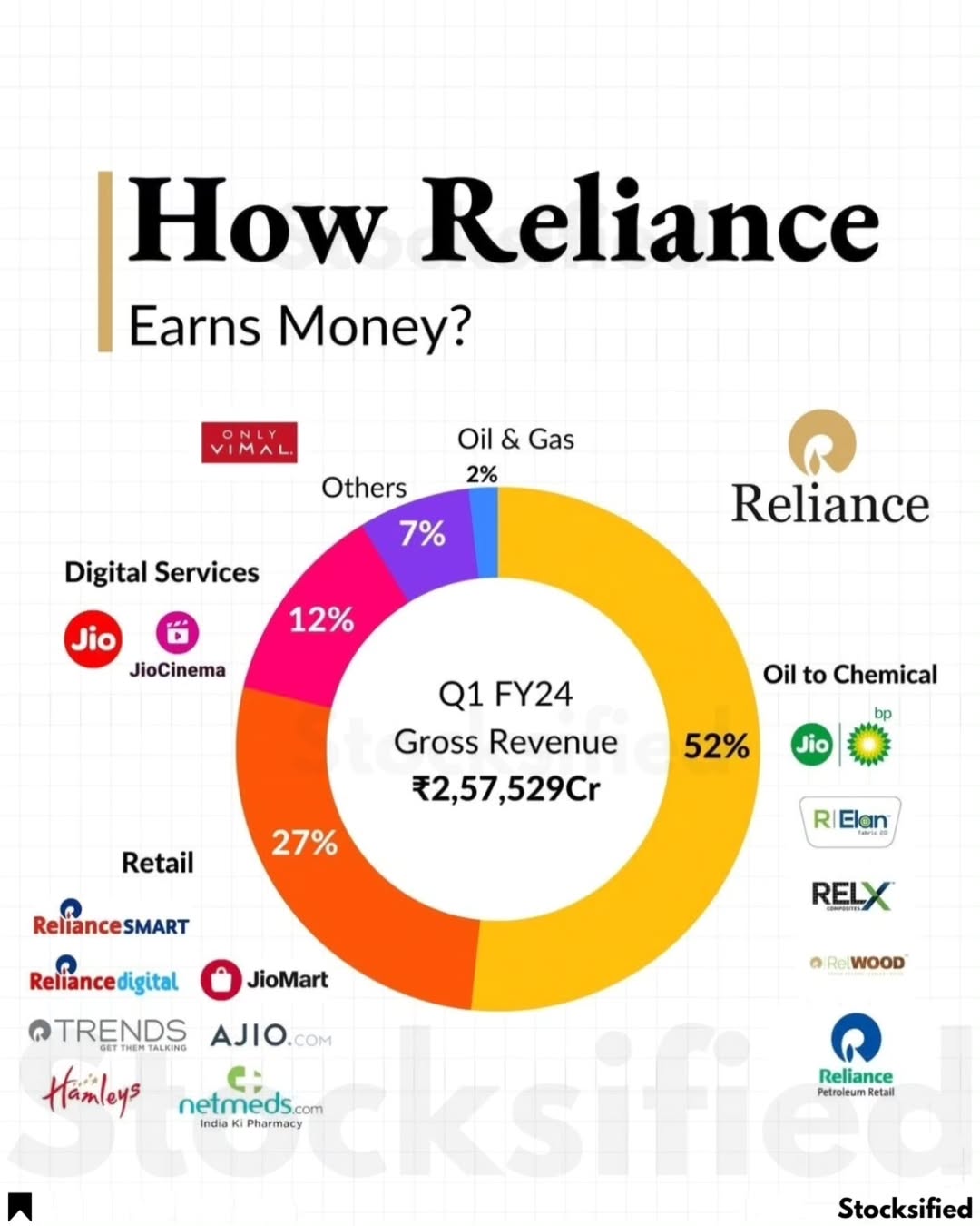 How Reliance Earns Money ๐ฐ โ Reliance Industries generated โน2,57,529 crore in Q1 FY24. โ Oil to Chemical business was the largest contributor with 52% of revenue. โ Retail contributed 27%, including Reliance SMART, AJIO, Hamleys, and JioMart