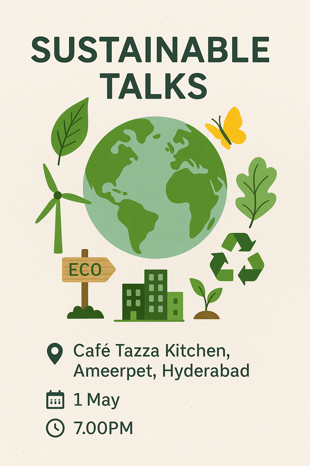 Hello Guys, i am hosting 'Sustainable Talks' (Casual Meet) @hyderabad for like minded youngsters, individuals, & entrepreneurs to discuss some real-life problems/solutions and discuss/identify some great ideas to work on. become a part of community (feel free to dm us)💚