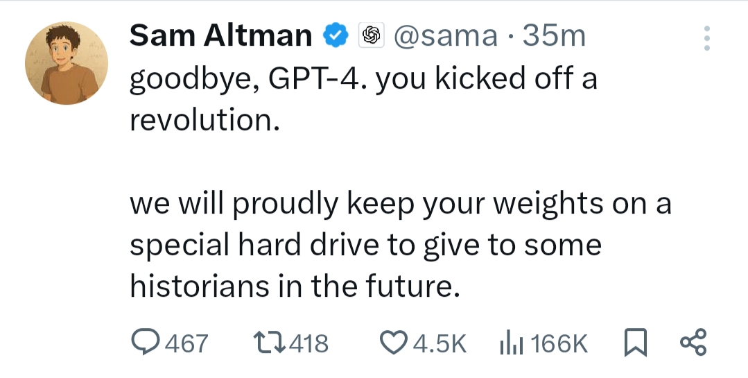 Big news in the AI world:💻🤖 Sam Altman just officially said goodbye to GPT-4, the model that powered much of the AI revolution over the past two years.👏 He shared that OpenAI will retire GPT-4’s weights and preserve them on a special hard drive — like a digital time capsule for future historians. ⭐Why does this matter? GPT-4 wasn’t just a model. It was the engine behind tools like ChatGPT, shaping how millions learned, worked, created, and communicated. Its retirement likely signals the arrival of something even more powerful — possibly GPT-5 or an entirely new architecture. This marks the end of one chapter… and the beginning of something much bigger. We’re witnessing history in real-time. Stay tuned — the next era of AI is just beginning. ❤️ this post for more ....