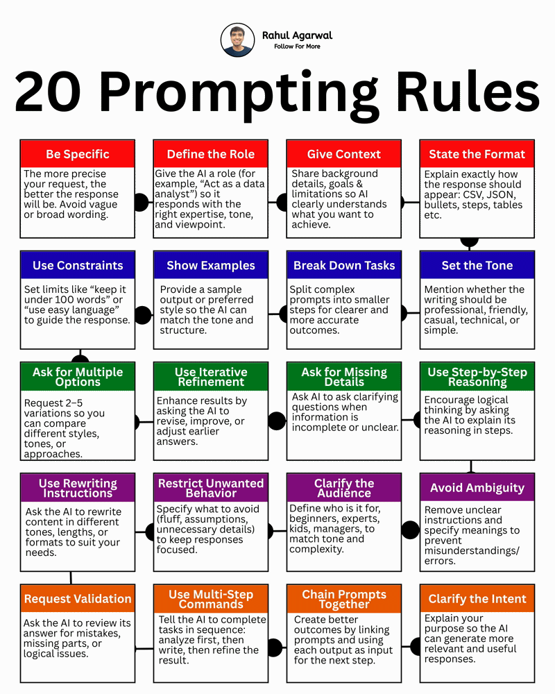20 prompting rules everyone must know. I've explained each in simple below. 1) ๐๐ฒ ๐ฆ๐ฝ๐ฒ๐ฐ๐ถ๐ณ๐ถ๐ฐ Donโt ask vague things like โExplain AI.โ Instead ask: โ๐๐น๐ฑ๐ญ๐ข๐ช๐ฏ ๐๐ ๐ช๐ฏ 5 ๐ฃ๐ถ๐ญ๐ญ๐ฆ๐ต ๐ฑ๐ฐ๐ช๐ฏ๐ต๐ด ๐ง๐ฐ๐ณ ๐ฃ๐ฆ๐จ๐ช๐ฏ๐ฏ๐ฆ๐ณ๐ด.โ Clear requ