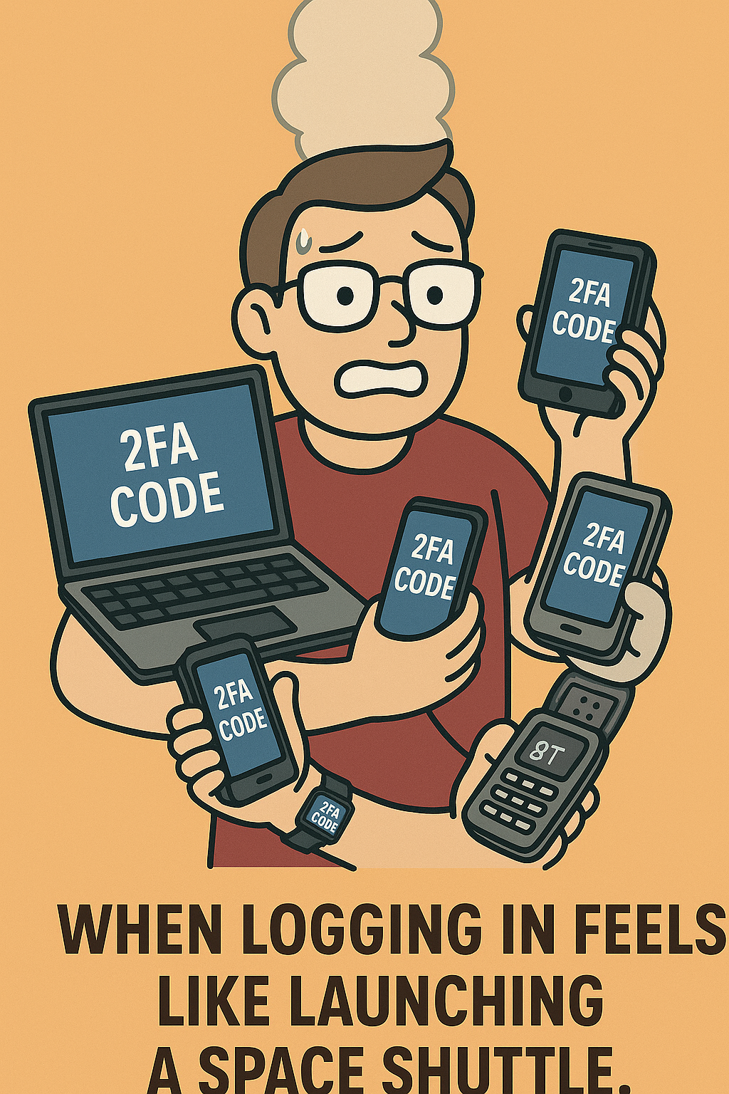 "2FA Struggles" Visual: A person holding 6 devices trying to get a 2FA code. Caption: “When logging in feels like launching a space shuttle. #CyberSecurityHumor #2FAStruggles #TechMeme #InfosecLife #LoginProblems #DigitalLife #CyberMeme #RelatableTech #ITLife #FunnyCyberSec #TechJokes #MFAstruggles #like #share #follow #comment #zehrasec #python #code #coding #ethicalhacking