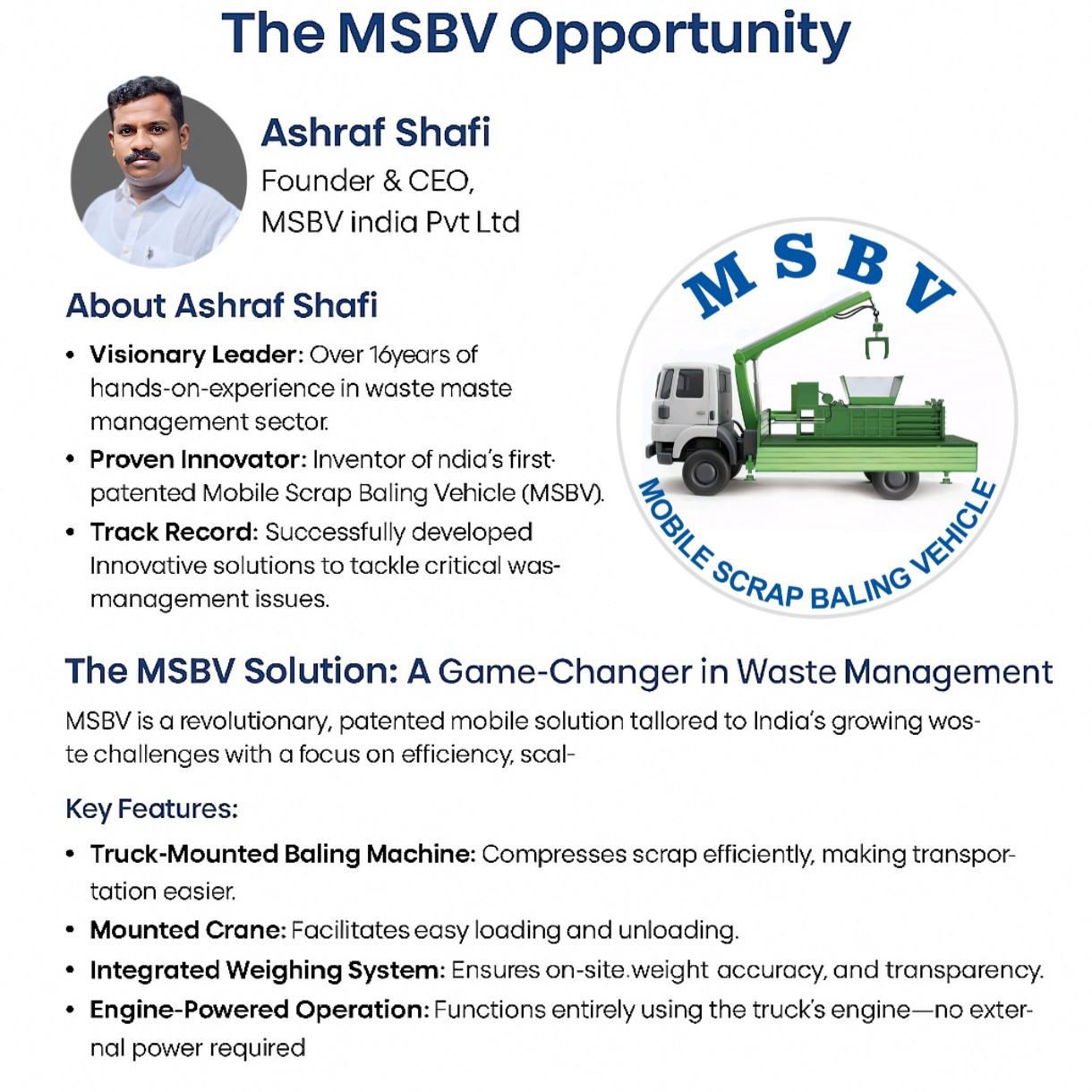 Revolutionizing Waste Management in India: The MSBV Opportunity (Mobile Scrap Baling Vehicle) Ashraf Shafi Founder & CEO, MSBV India Pvt. Ltd. Kozhikode, Kerala, India About Ashraf Shafi Visionary Leadership With over 16 years of hands-on experience in the waste management sector, Ashraf Shafi has established himself as a pioneering force in environmental innovation. Proven Innovator Ashraf is the inventor of India’s first patented Mobile Scrap Baling Vehicle (MSBV)—a groundbreaking solution transforming how waste is collected, processed, and managed across the country. Track Record of Impact He has consistently delivered practical, scalable solutions to some of India’s most critical waste management challenges. The MSBV Solution: A Game-Changer in Sustainable Waste Handling MSBV is a revolutionary, mobile, and patented waste management system designed to address India’s growing waste challenges. It offers a smart, efficient, and eco-friendly approach to scrap collection and compression. Key Features Truck-Mounted Baling System On-site compression of scrap materials, reducing bulk and optimizing transport efficiency. Hydraulic Crane Seamless loading and unloading of waste, reducing manual labor. Integrated Weighing System Accurate, real-time weight measurements for complete transparency and operational integrity. Engine-Powered Efficiency Entirely powered by the truck’s engine—no need for external electricity or fuel sources. Why MSBV is the Right Investment First-of-Its-Kind Innovation India’s first and only patented mobile scrap baling vehicle, tapping into a ₹14,000+ crore industry. Massive Market Potential Public Sector: Municipal Corporations, Local Governments, Panchayats Private Sector: Scrap Dealers, Recycling Enterprises, Industrial Waste Handlers Environmental & Economic Value Reduces carbon emissions by minimizing long-distance transport Enables localized waste processing in both urban and rural areas Lowers operational costs and improves recycling turnaround Investor Proposition Sector Outlook Waste management in India is on a sharp upward trajectory Increasing government and private sector focus on sustainability Revenue Model Recurring monthly income through contracts, services, and partnerships High-margin operations with low running costs Scalable & Secure Operable across diverse geographies Protected by patent, offering a clear first-mover advantage Upcoming Milestone: May 2025 Launch Join us as we unveil India’s first Mobile Scrap Baling Vehicle, setting a new standard in responsible waste management. Investment Opportunity Total Project Cost: ₹85 Lakhs Investment Required: ₹42.5 Lakhs (50%) Profit Sharing: 50% of net monthly profits Agreement Term: 11 months Asset Ownership: Vehicle will be initially registered in the investor’s name, with a re-registration option upon exit Join the Green Revolution Partner with us to build a cleaner, smarter India—one scrap at a time. Contact: Ashraf Shafi Phone: +91 99464 48899 / +91 90728 36373 Email: ashrafshaficv@gmail.com Website: www.msbvindia.com