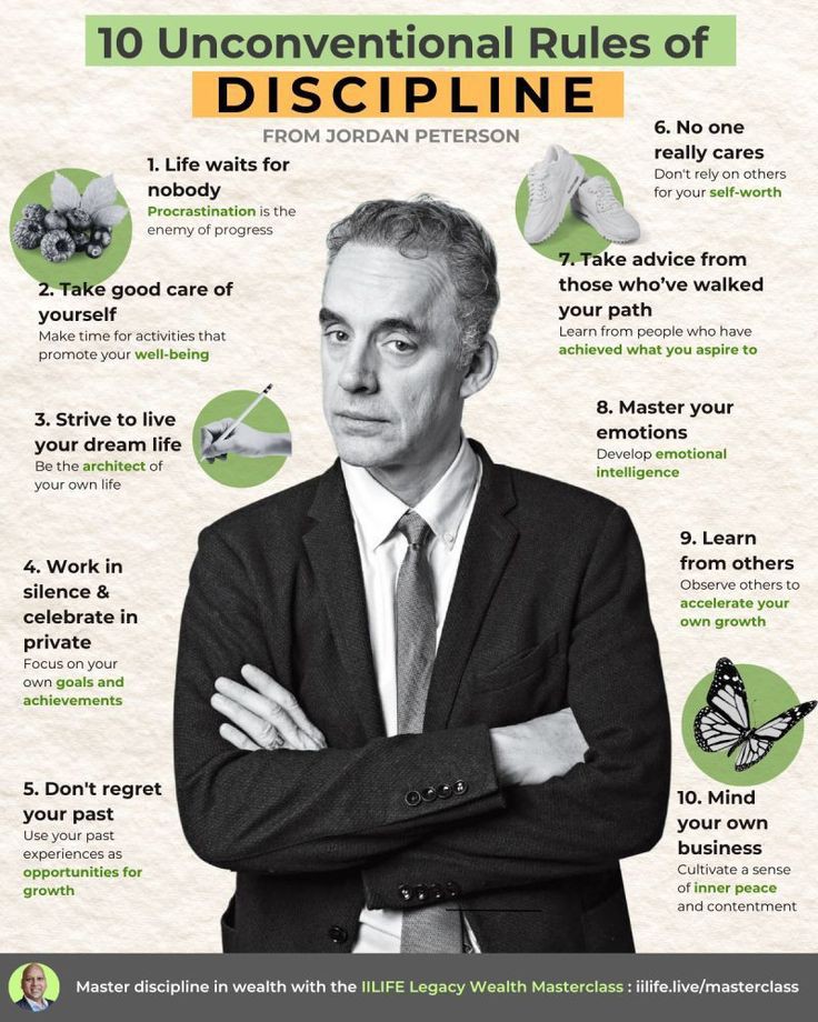 10 Unconventional Rules of Discipline — From Jordan Peterson's Perspective 🔸 Jordan Peterson is a Canadian psychologist, professor, and author known for his views on people's behaviour and culture. 🔸 1. Life waits for nobody I’ve seen how procrastination cripples people’s potential. Time doesn’t pause for your hesitation — progress comes only when you act. ⏳ 2. Take good care of yourself Discipline starts with well-being. I make time for the habits that keep me mentally and physically strong. 🧘♂️ 3. Strive to live your dream life No one else is going to build your life for you. I believe in designing it myself — on purpose, not by accident. ✍️ 4. Work in silence & celebrate in private Quiet discipline brings powerful results. I focus on my goals without needing applause. 🎯 5. Don't regret your past Your past isn’t your prison — it’s a source of wisdom. I use my mistakes as lessons, not burdens. 🔁 6. No one really cares Depending on others for validation is a trap. I learned to build my self-worth from within. 🚫 7. Take advice from those who’ve walked your path I seek mentors who’ve achieved what I’m aiming for. Their insights are gold. 🧭 8. Master your emotions Discipline isn’t just external — it’s inner mastery. I’ve worked to develop emotional intelligence so I can respond, not react. 🧠 9. Learn from others Everyone you meet knows something you don’t. I watch and learn — constantly. 👀 10. Mind your own business Peace isn’t found in comparison or gossip. I’ve found clarity by focusing on what truly matters to me. ☮️