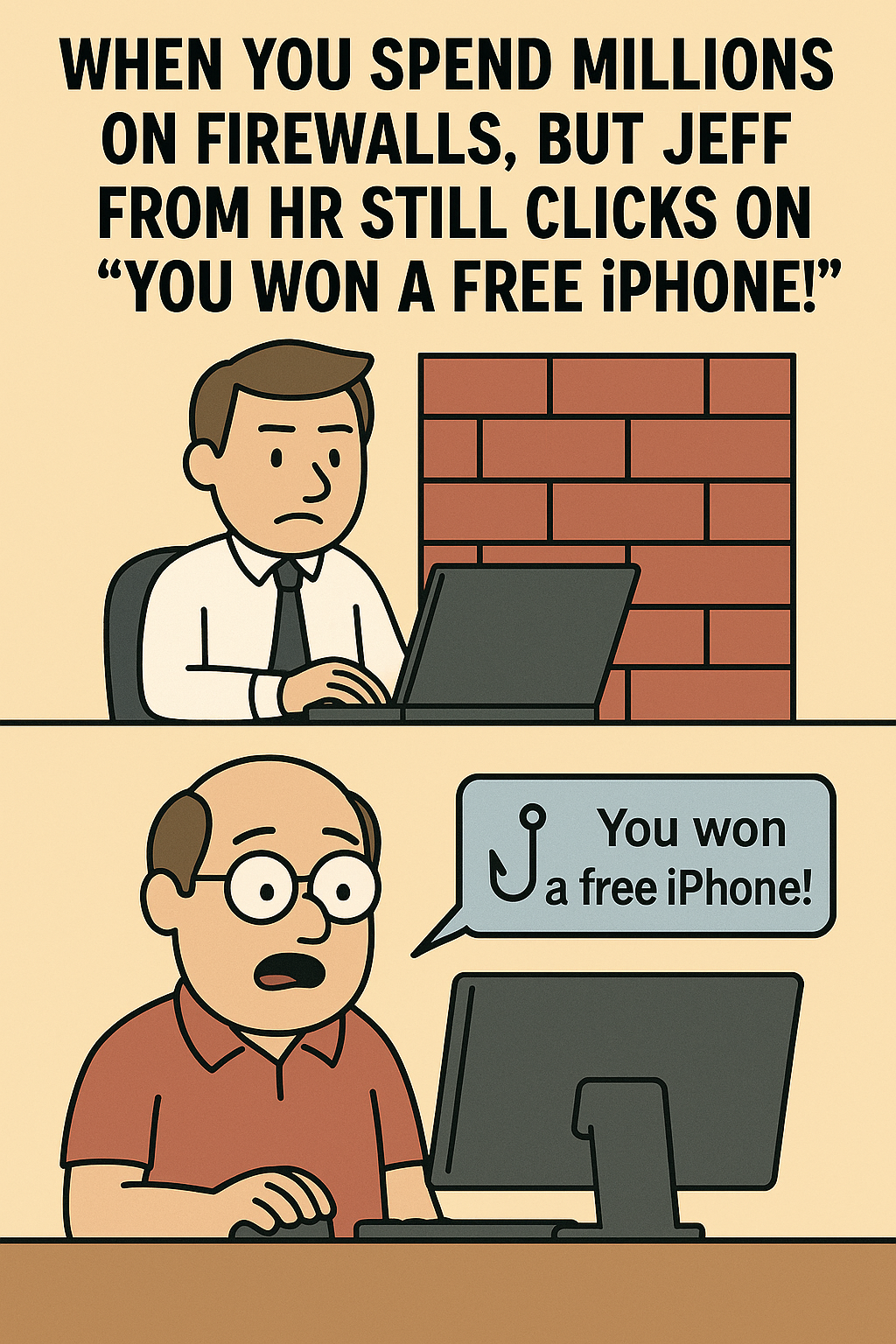 When you spend millions on firewalls, but Jeff from HR still clicks on 'You won a free iPhone!' #NetworkSecurity #CyberSecurityHumor #TechMeme #ITLife #PhishingFails #InfoSec #FirewallFails #TechComedy #RelatableIT #MemeLife #like #share #follow #com