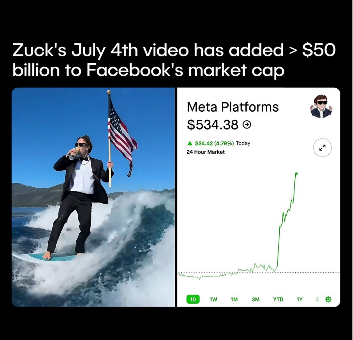 Mark Zuckerberg's video celebrating the 4th of July had a surprisingly significant impact on Facebook's market value, adding more than $50 billion to its market capitalization. The video, which showed Zuckerberg surfing with the American flag while