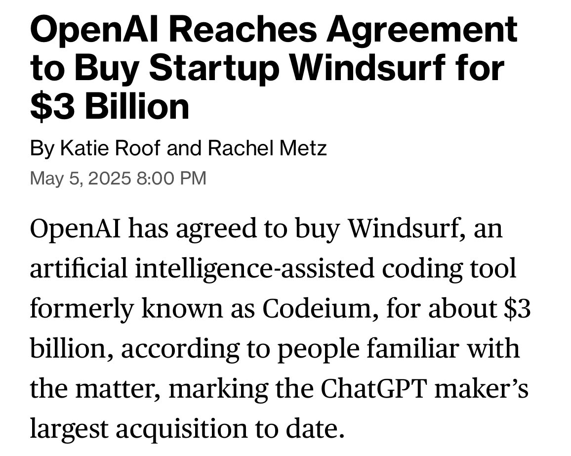 OpenAI Eyes Major AI Coding Tool Acquisition! OpenAI is reportedly in talks to acquire Windsurf (formerly Codeium) for a massive $3 billion. This move would pit OpenAI directly against other AI coding assistants like Cursor by Anysphere. Windsurf