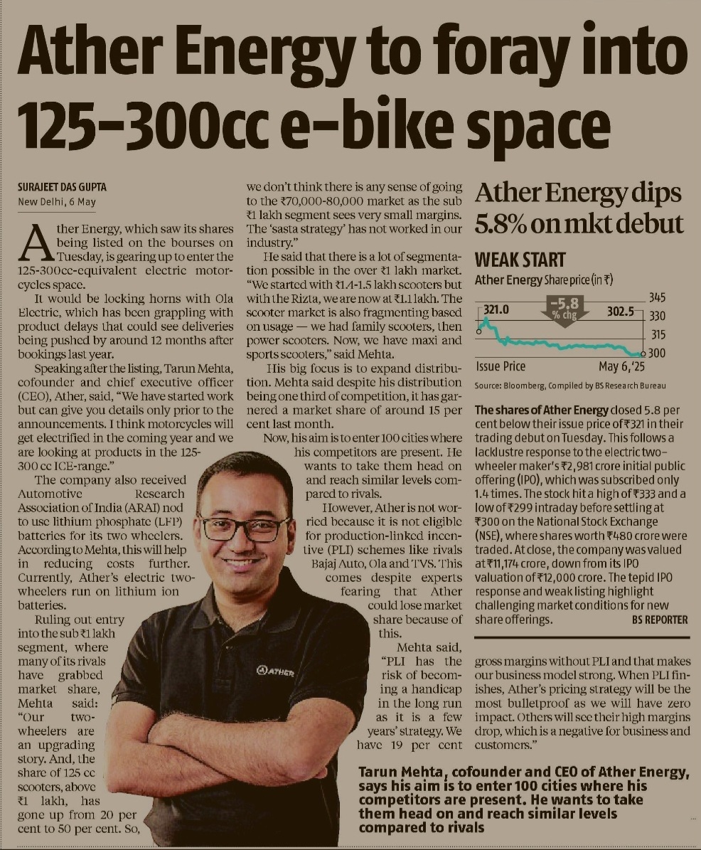 "Ather Powers Up: Ditches 'Sasta' Scooters to Take the High-Voltage Road to 300cc Glory!" Ather Energy’s bold move into the 125–300cc e-bike segment feels like watching a clever underdog enter the big leagues with a confident grin. Tarun Mehta’s game plan? Take on the giants, skip the "sasta strategy," and bet big on quality and real-world use cases. It’s gutsy—and refreshing. Sure, their stock stumbled on day one, but let’s face it, innovation rarely gets a red carpet. If Ather nails performance and pricing while dodging the PLI pothole, they might just zoom past the skeptics. Buckle up—this ride could get exciting!