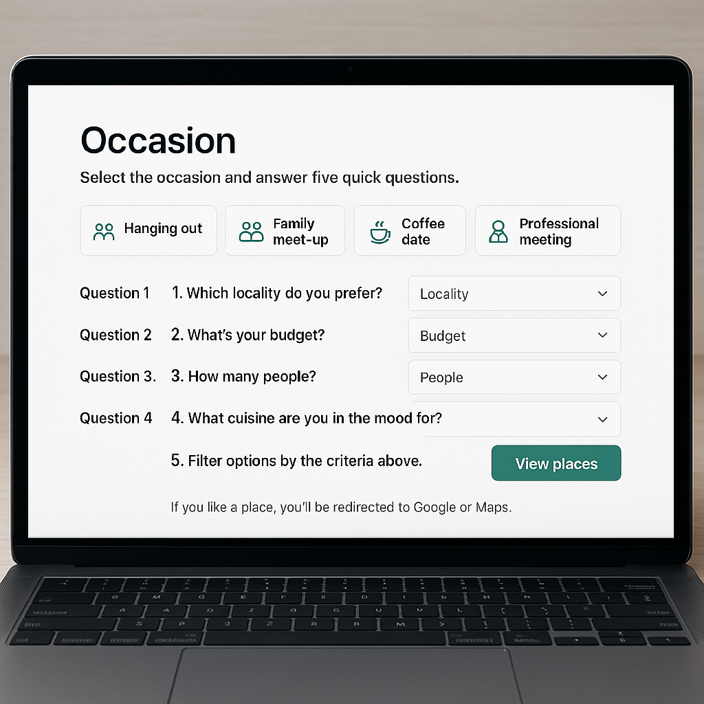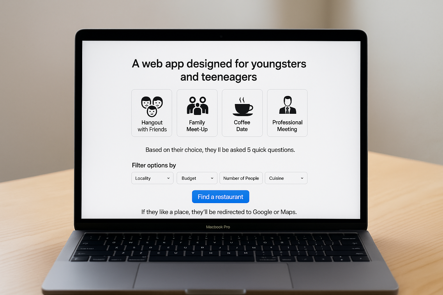 I FAILED AGAIN AND AGAIN BUT STILL , I'm trying to building a web app designed for youngsters and teenagers where they can choose the occasion—like hanging out with friends, family meet-ups, coffee dates, or professional meetings. Based on their ch