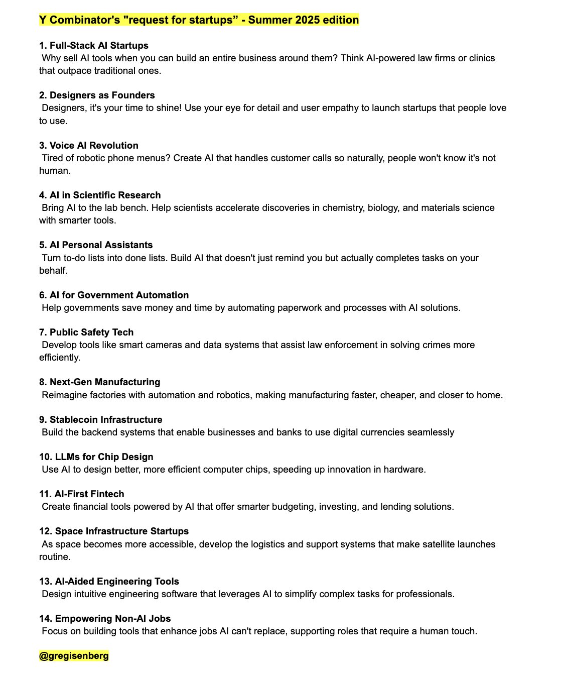 Y Combinator just shared the startups they want to invest in for summer 2025. The big theme is AI that turns 40-hour jobs into 40-minute tasks.