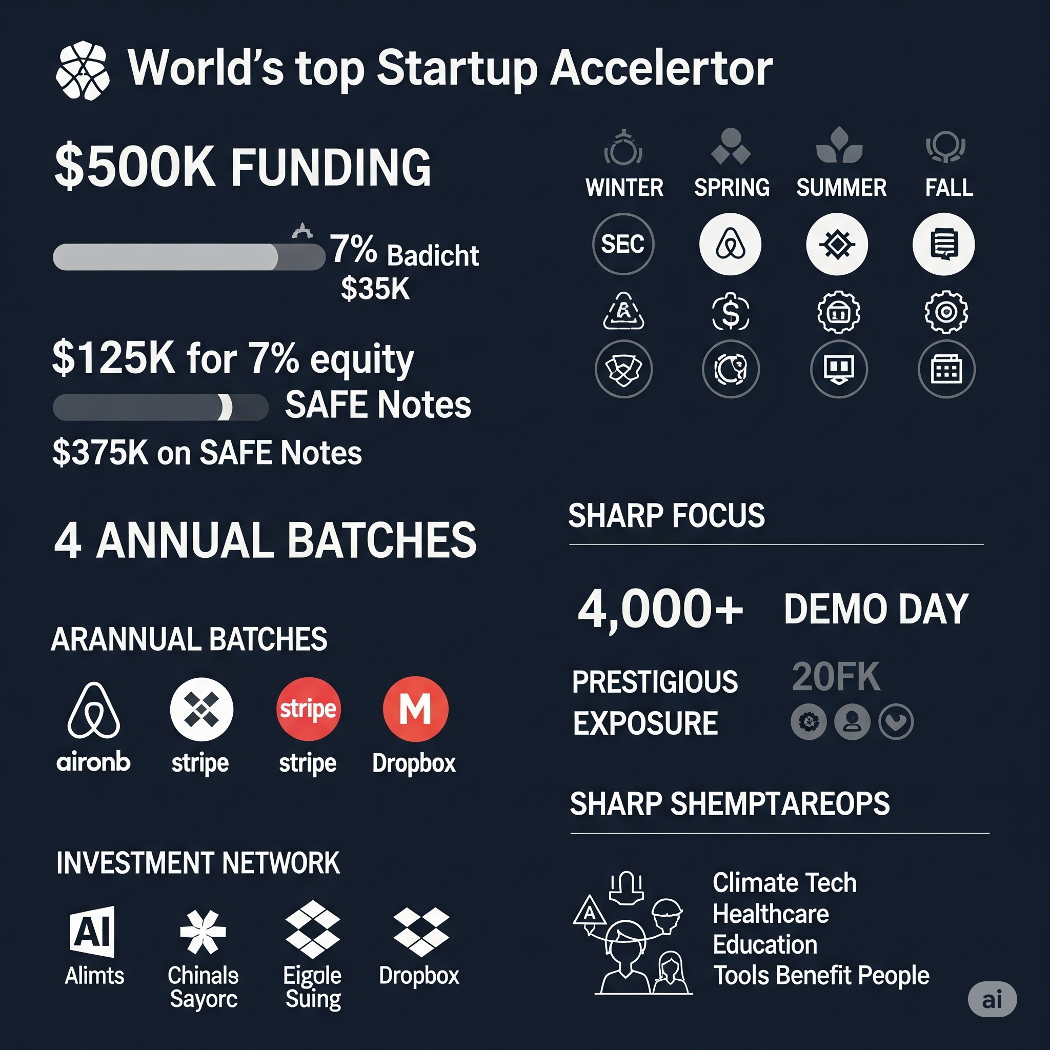 Y Combinator in 30 Seconds: ✅ World’s top startup accelerator 💵 Offers $500K funding ($125K for 7%, $375K on SAFE) 🗓️ 4 batches/year (Winter, Spring, Summer, Fall) 👥 Backed Airbnb, Stripe, Dropbox, and 4,000+ startups 📈 Massive network + Dem