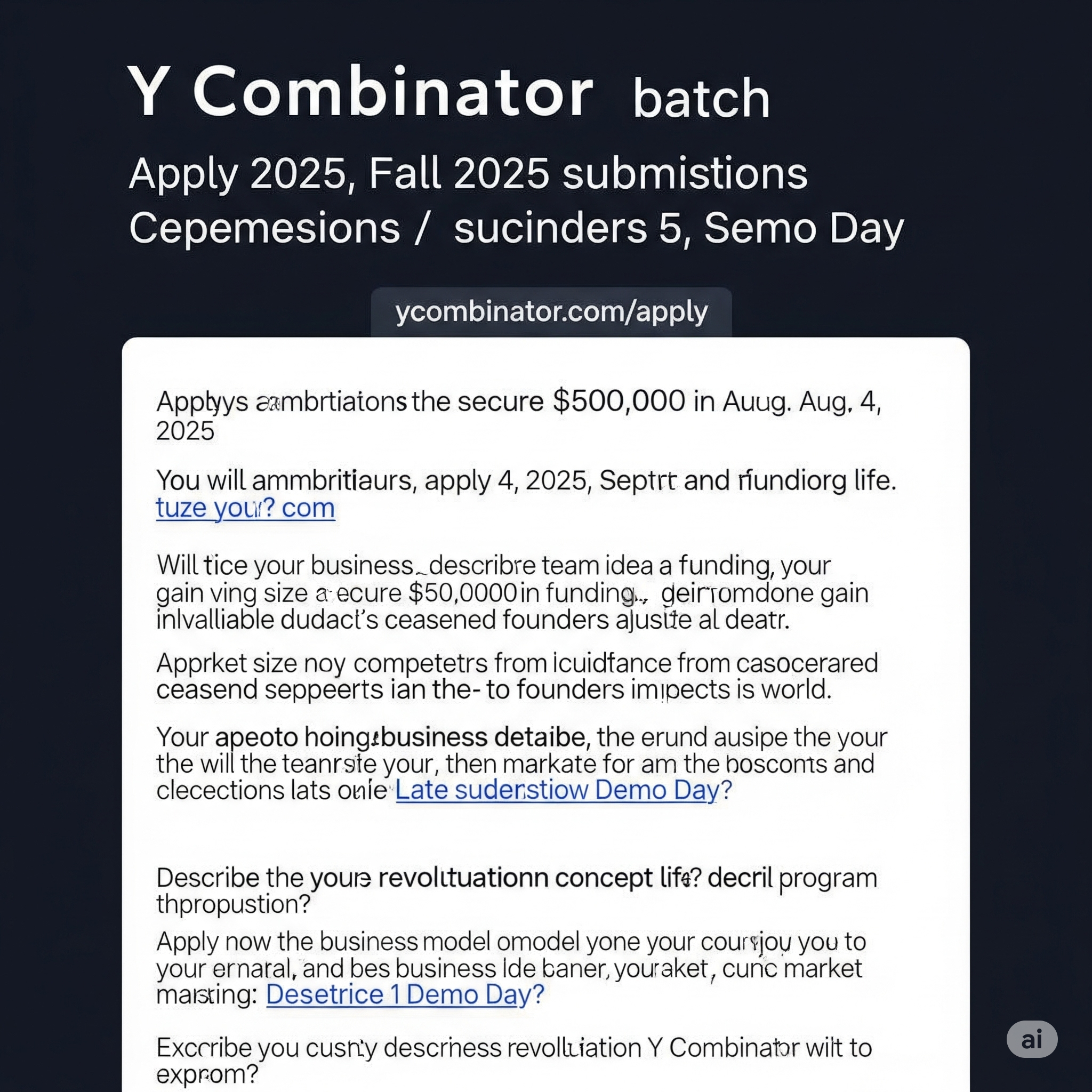 Y Combinator Fall 2025 Batch is Open! Want to raise $500K, get mentored by top founders, and pitch at Demo Day? YC is now accepting applications for the Fall 2025 batch. 🗓️ Deadline: August 4, 2025 — 8 PM PT 📬 Apply on time = decision by Sept 5,