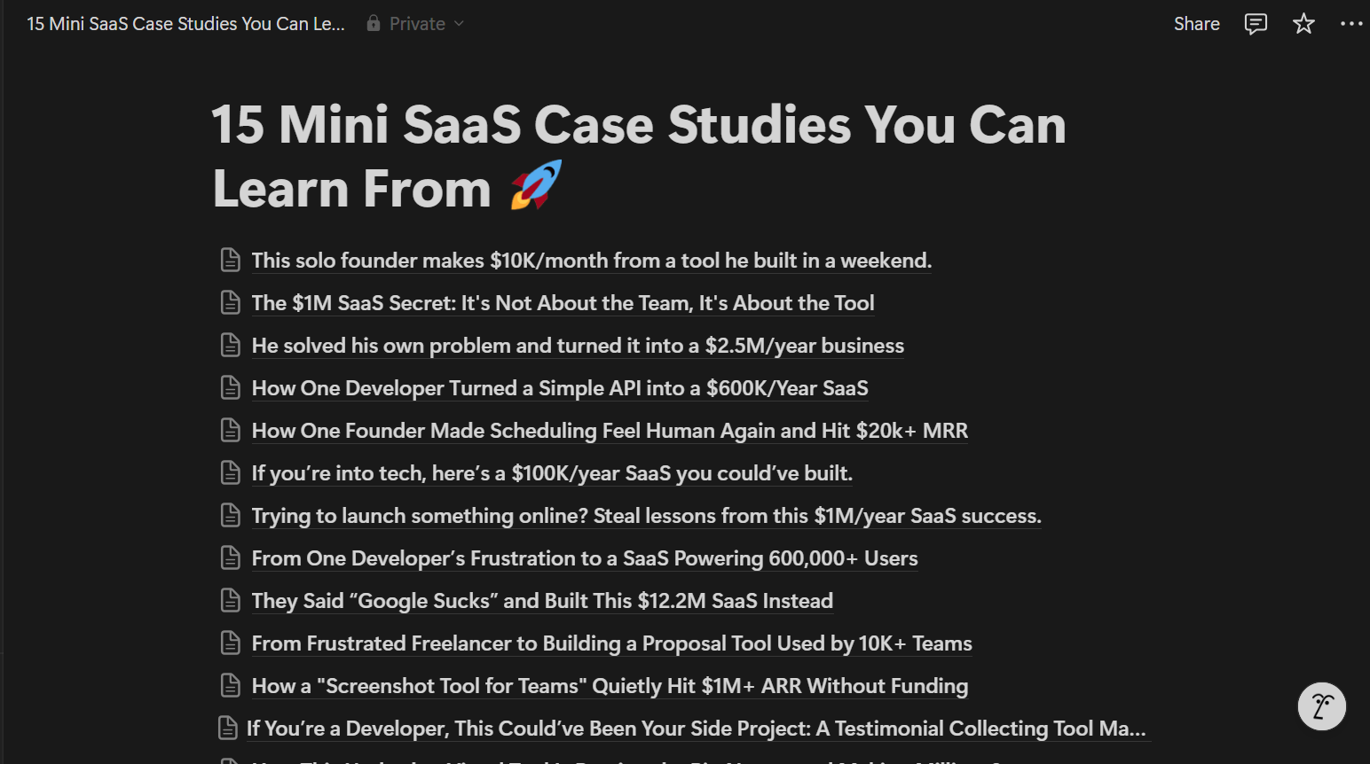 So, I recently did a series of mini case studies on various SaaS products, digging into how simple ideas turned into real businesses. Now, Iโve compiled 15 of them into one neat Notion pack. Itโs short, insightful, and gives you a quick overview
