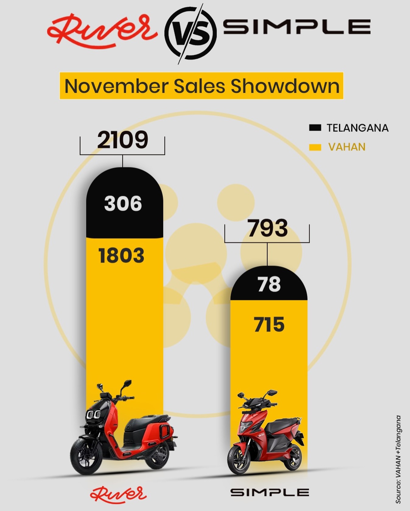 ๐๐ข๐ฏ๐๐ซ ๐ฃ๐ฎ๐ฌ๐ญ ๐๐ซ๐จ๐ฉ๐ฉ๐๐ ๐ ๐๐จ๐ฆ๐ ๐ข๐ง ๐๐จ๐ฏ๐๐ฆ๐๐๐ซ. When you combine VAHAN + Telangana data, the gap is wild: ๐น River: 2109 units ๐น Simple: 793 units Thatโs nearly 3X higher, powered by stronger registrations and a far wider marke