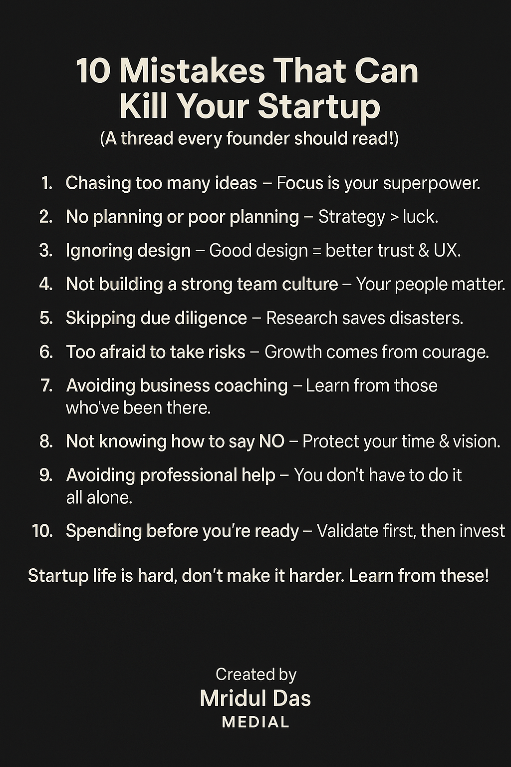 10 Mistakes That Can Kill Your Startup (A thread every founder should read!) 1. Chasing too many ideas โ Focus is your superpower. 2. No planning or poor planning โ Strategy > luck. 3. Ignoring design โ Good design = better trust & UX. 4. Not bui