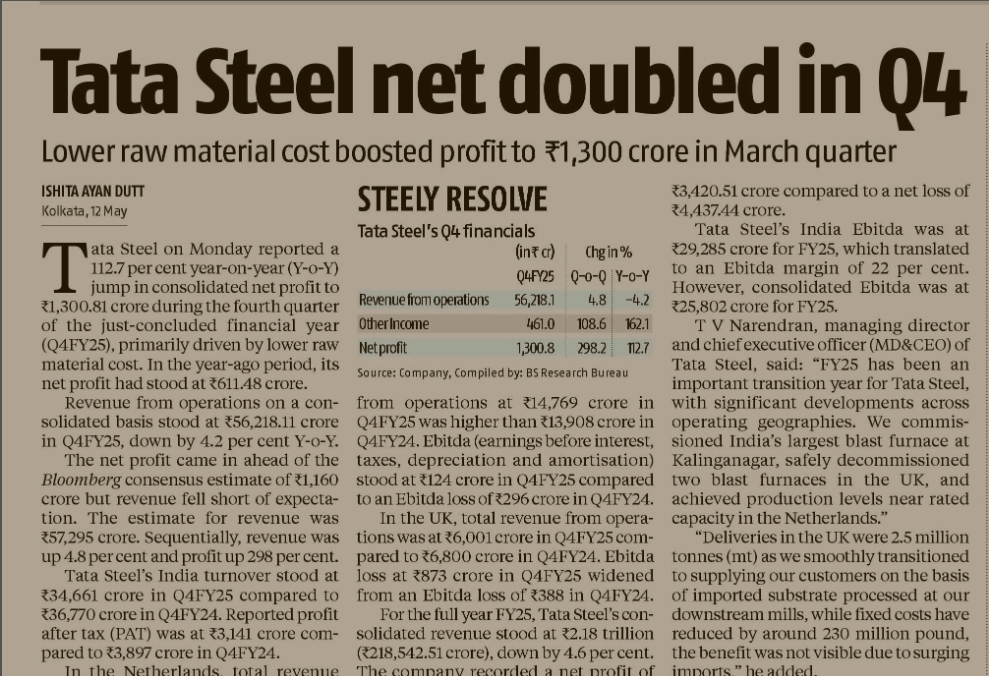 "Tata Steel Smashes Q4—Profits Double as Costs Melt Away!" Tata Steel just flexed its financial muscles! Net profit for Q4FY25 more than doubled—soaring 112.7%—thanks to a handy drop in raw material costs. That’s ₹1,300.81 crore in the bank versus ₹611.48 crore last year. Sure, revenue dipped a bit, but profit clearly said, “Hold my steel beam.” With India operations shining and Europe finding its rhythm, Tata Steel is forging ahead—literally and financially.
