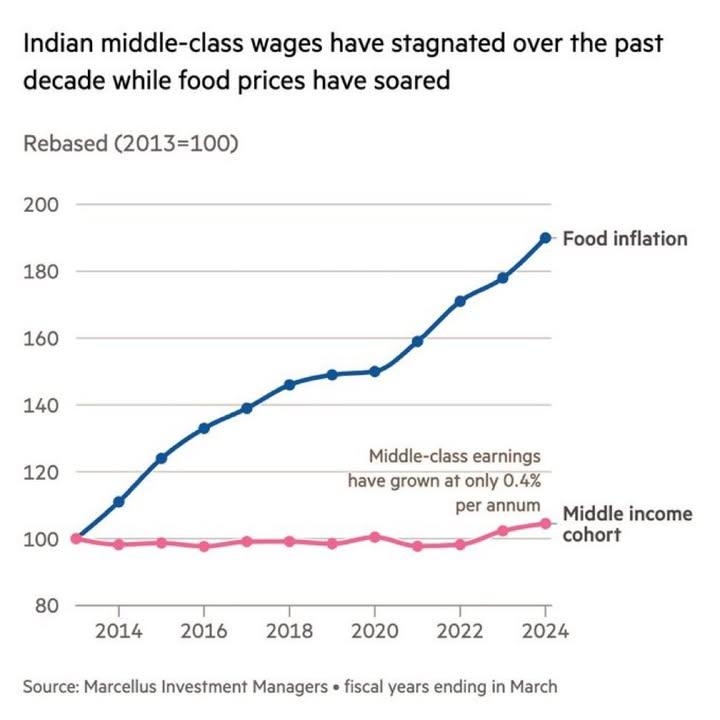 This is a staggering chart. Indian middle class wages have stagnated over the past decade while food prices have gone up.