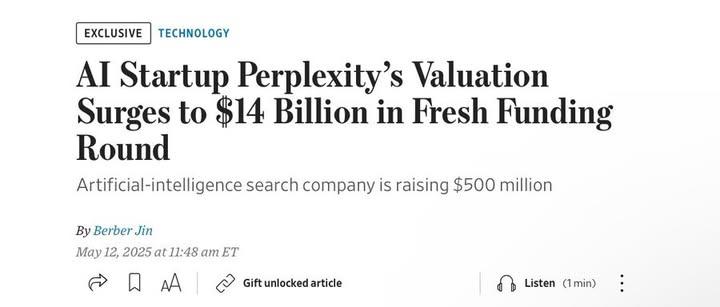 Perplexity AI is reportedly closing in on a $500 million funding round at a $14 billion valuation. That’s nearly 5x growth in under a year. 📌 Summary – Perplexity in talks for $500M @ $14B – Accel to lead round – ARR just under $100M – Competing