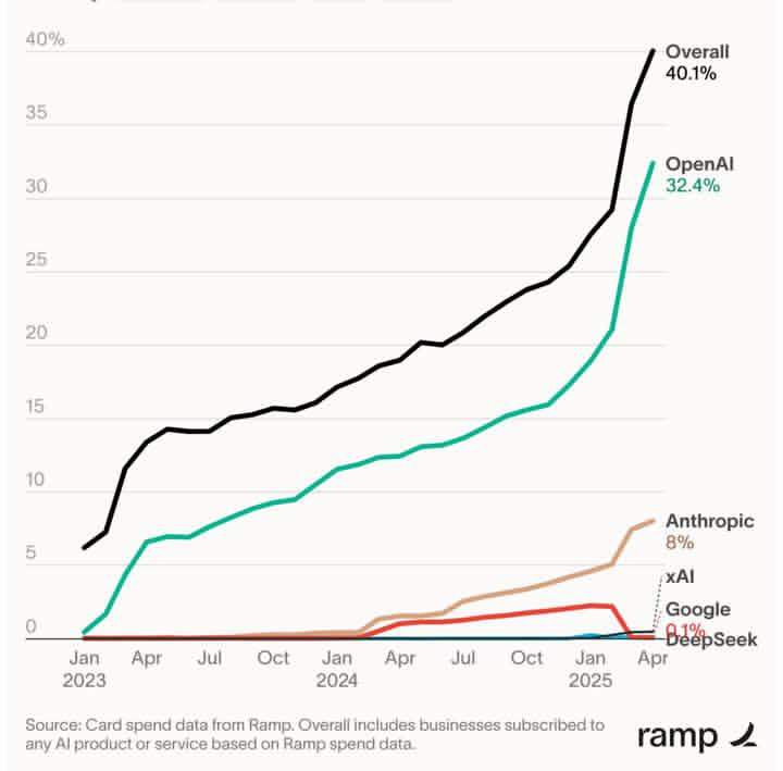 🚀 OpenAI is DOMINATING! 🚀 32.4% of U.S. businesses are on board. From 18.9% in January. Google is at a staggering 0.1%. Competitors are eating dust. Can they catch up? 🧠 Stay tuned.