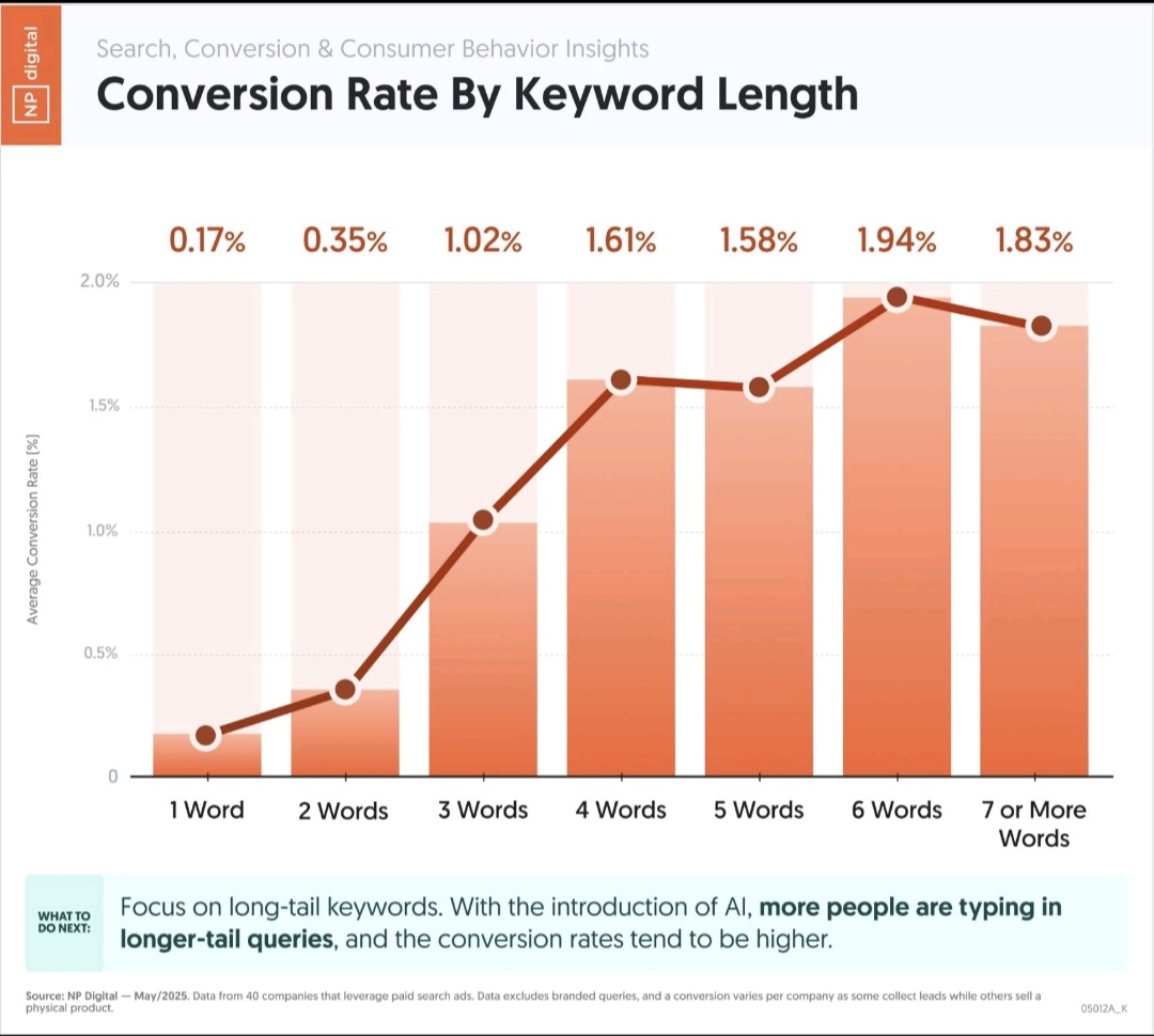 Conversion Rate By Keyword Length Long-tail keywords may not drive as much traffic as head terms, but they do drive conversions Look at the average conversion rate by keyword length. This data is from 40 companies that run search ads_