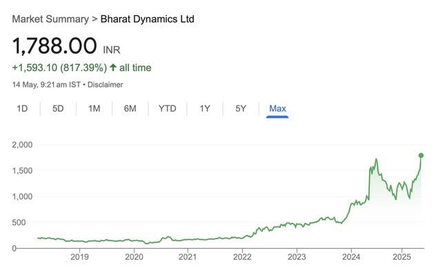 BDL, maker of the Akash Missile System, just hit a fresh all-time high! The stock is up over 800% in the last five years. Amazing.