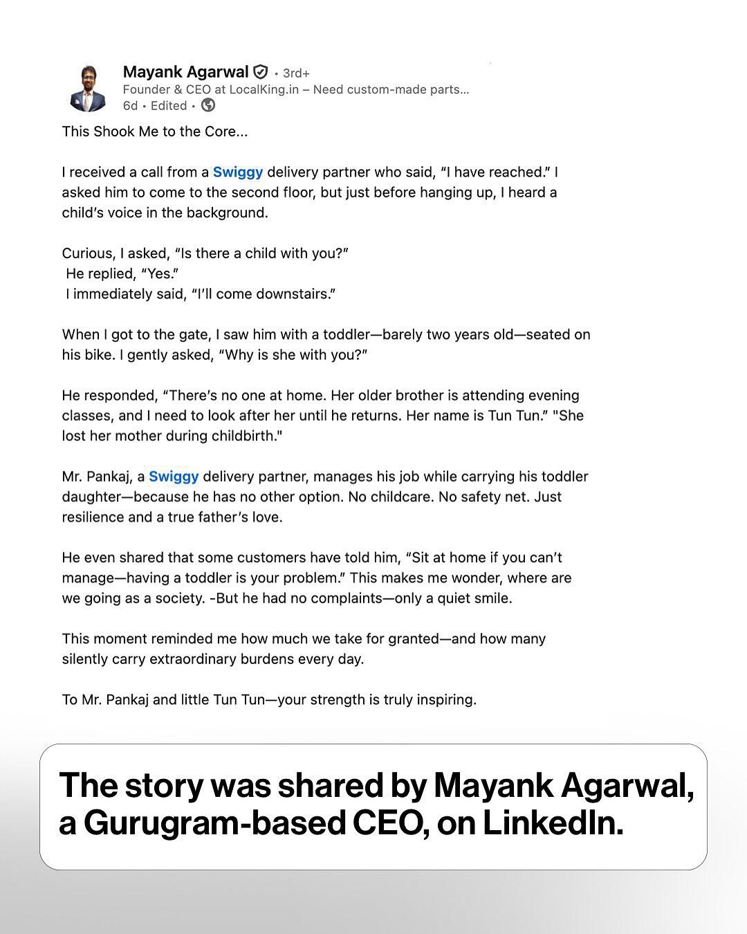 A father's love knows no limits. Mayank Agarwal, a CEO from Gurugram, shared a touching moment on LinkedIn: A Swiggy delivery partner named Pankaj, delivering food with his little daughter seated behind him on the bike. Not because he wanted to. But because he had no other choice. With no one to look after her, he chose to take her along—balancing his work and parenting, both on two wheels. The post quickly went viral. Some offered help. Some shared kind words. And many raised an important point: **Why isn’t there better support for parents like him—especially in the gig economy?** This story isn’t just about struggle. It’s about strength, sacrifice, and the kind of love that keeps going, no matter what.