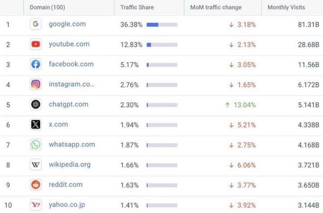 last year chatgpt was the 15th most visited website Now itโs 5th. ๐คฏ