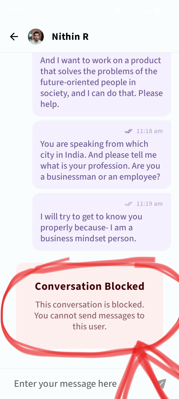 Hey guys 👋👋 I am Joydipta Mahajan. Look I got blocked again. I was talking or texting an entrepreneur, but since then I have been blocked. Can anyone tell me why this is happening in this company? As a businessman, why can't I talk to other entre
