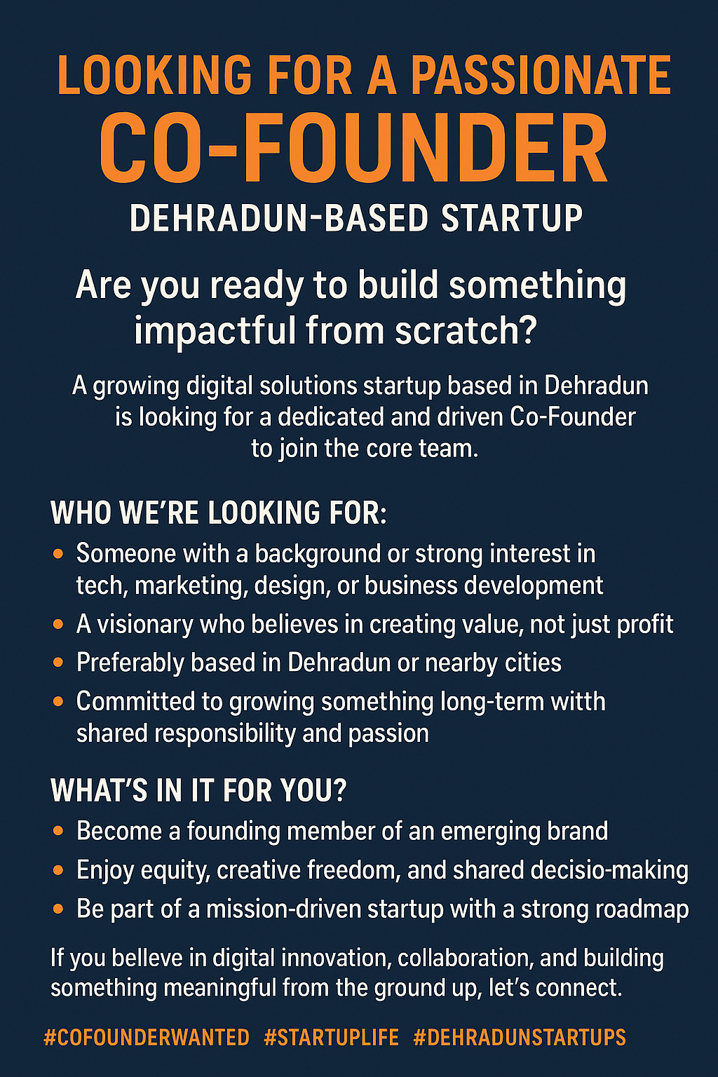 [Looking for a Passionate Co-Founder | Dehradun-Based Startup] Are you ready to build something impactful from scratch? A growing Digital Solutions startup based in Dehradun is looking for a dedicated and driven Co-Founder to join the core team. Who I'm Looking For: Someone with a background or strong interest in Tech, Digital Marketing, Design, or Business Development etc. A visionary who believes in creating value, not just profit Preferably based in Dehradun or nearby cities Committed to growing something long-term with shared responsibility and passion What’s in it for You? Become a founding member of an emerging brand Enjoy equity, creative freedom, and shared decision-making Be part of a mission-driven startup with a strong roadmap If you believe in digital innovation, collaboration, and building something meaningful from the ground up, let’s connect. Drop a DM or comment below. Your next big journey might just start here.