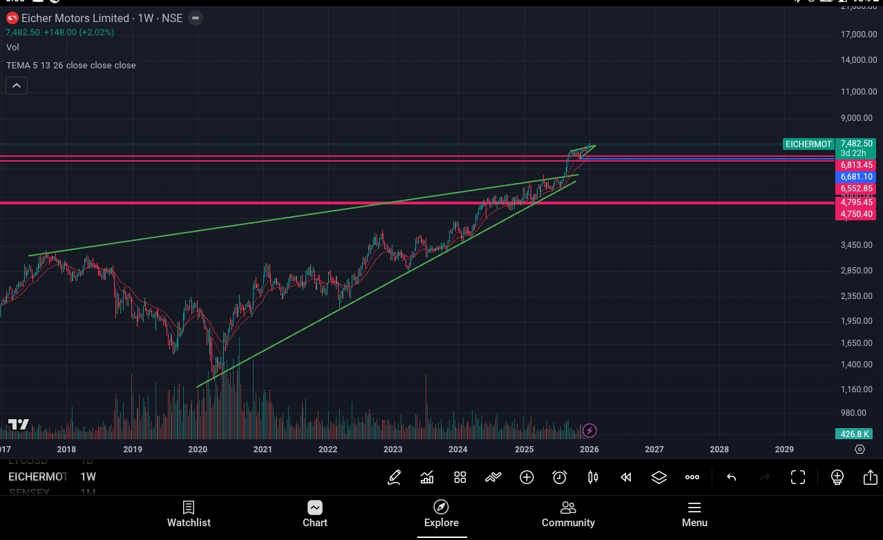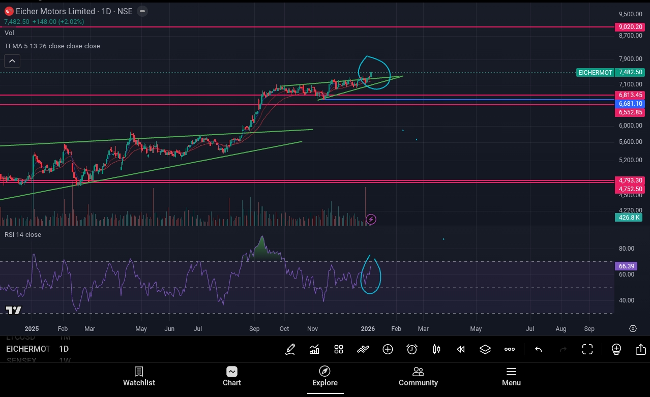 📊 Technical Analysis – Eicher Motors Ltd (Academic Purpose Only) Target = 9905 Entry = 7482 Stop loss = 7157 Risk = 325 Reward = 2423 🎯 Risk Reward ratio = 1:7.4 📈 RSI: 66+ (Strong Momentum) 📉 EMA Crossover: Bullish Confirmation Candle = Green
