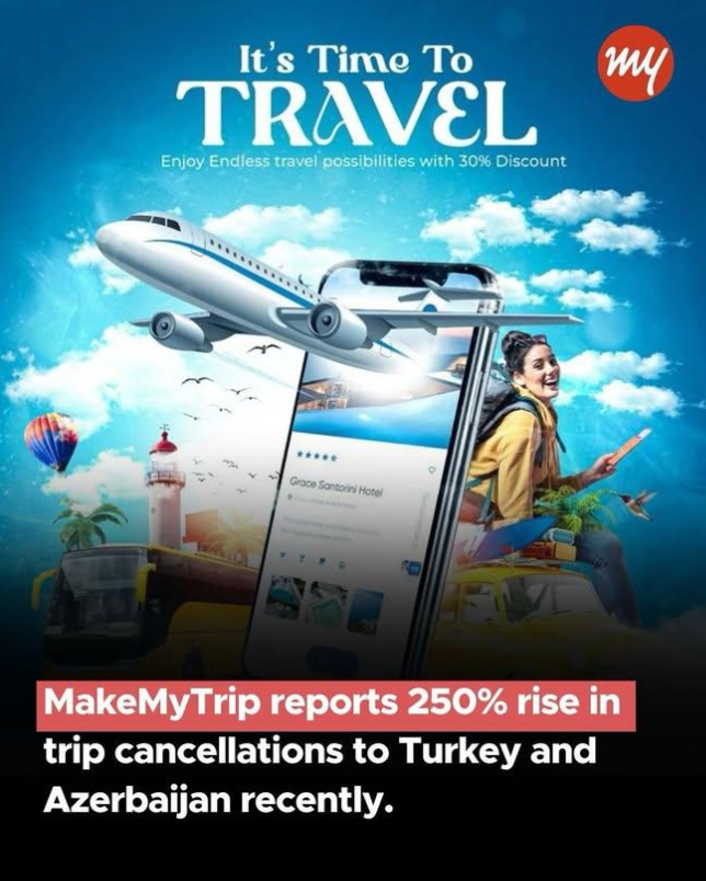 MakeMyTrip sees a 250% spike in cancellations toTravel plans on hold! 📉 MakeMyTrip sees a 250% spike in cancellations to Turkey and Azerbaijan. Uncertain times call for flexible bookings. ✈️❌