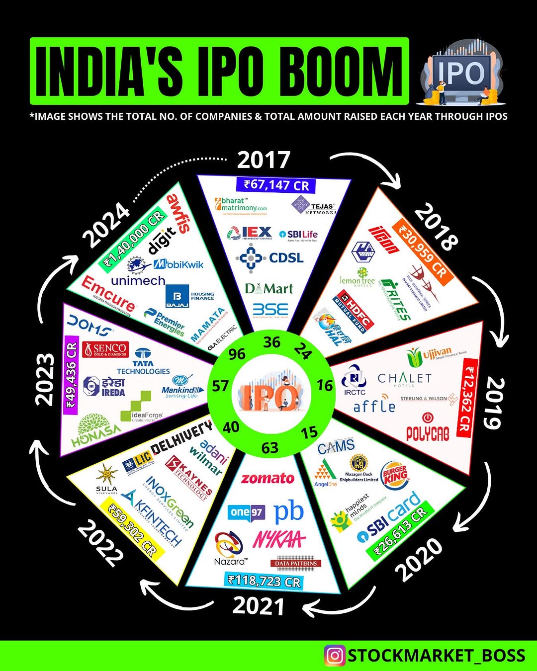 INDIA'S IPO BOOM: A JOURNEY THROUGH YEARS! 🚀 India’s IPO market has been on fire, witnessing a massive surge in companies going public and raising huge funds. Here’s how the IPO trend evolved from 2017 to 2024: 📊 The Highlights 1️⃣ 2024: The B