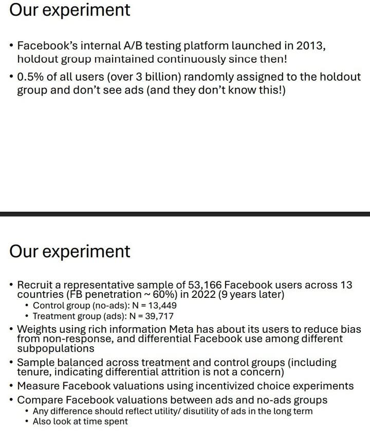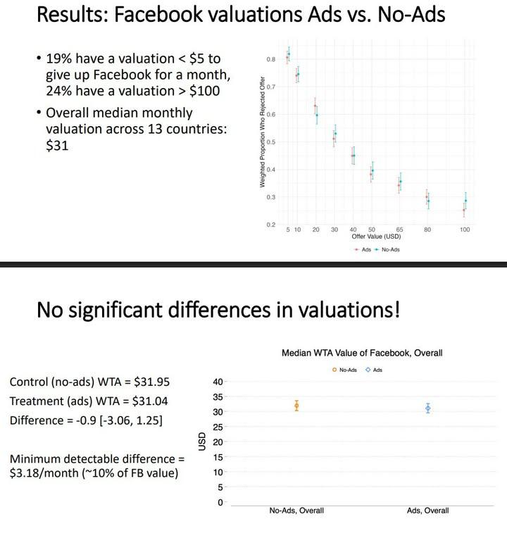 Facebook has secretly kept 0.5 % of users ad-free since 2013. After 9 years, their “give-up-Facebook” price is basically the same as ad-exposed users (~$32/month).