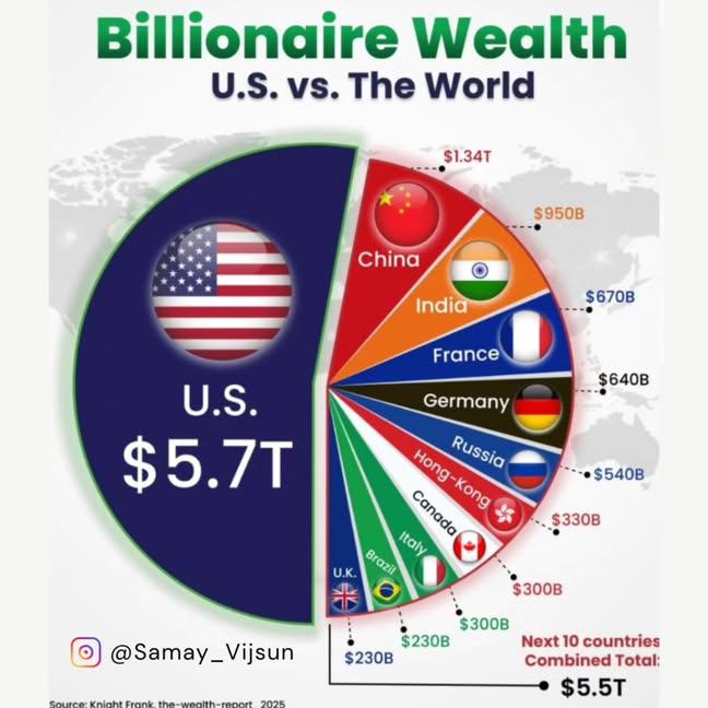 The Billionaire Breakdown! The U.S. alone holds more billionaire wealth ($5.7T) than the next 10 countries combined ($5.5T). Crazy, right? This chart says it all — Wealth isn’t evenly distributed. Which country do you think will rise next?