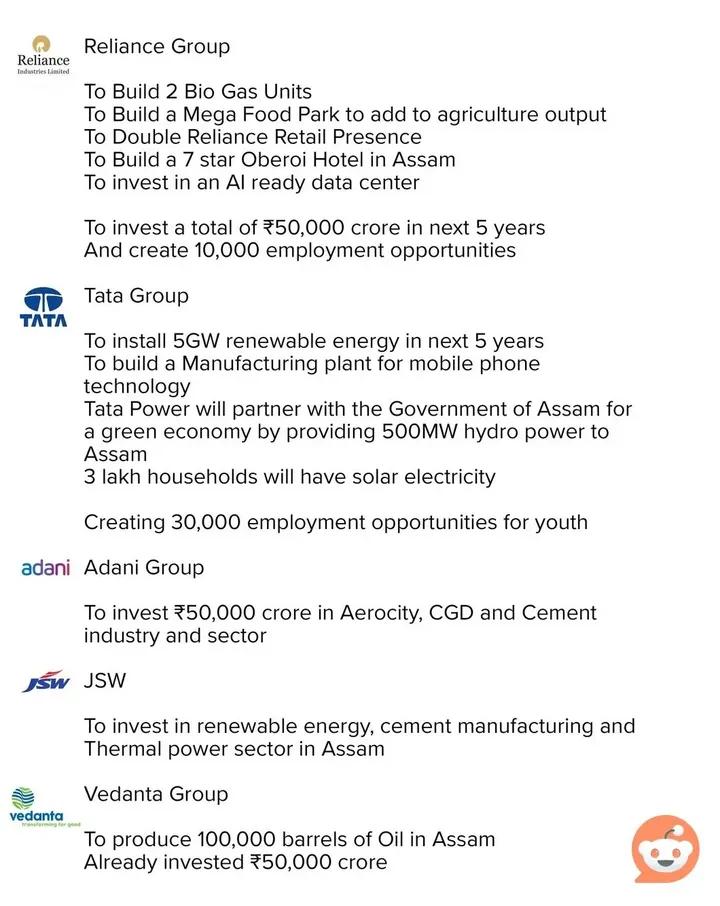 Several major business conglomerates announced significant investment commitments at the Assam Summit yesterday, promising substantial economic growth and job creation in the state. Reliance Group: The company pledged an investment of ₹50,000 crore