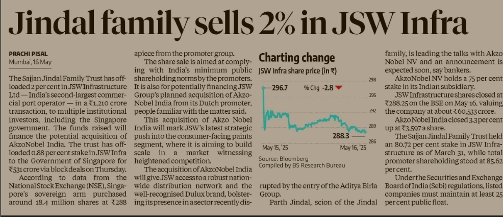 "Jindals Cash Out 2%, Eye a Colorful Coup with AkzoNobel!" Looks like the Jindal family just made a power move—offloading 2% in JSW Infra for a cool ₹1,210 crore! Why? To possibly bag AkzoNobel India, the paint giant, and stay Sebi-compliant. Singapore’s government even chipped in with ₹531 crore! Meanwhile, JSW Infra shares took a tiny dip—like a nervous heartbeat before a big play. Parth Jindal seems to be painting a bold future—literally. Buckle up, the corporate chessboard just got spicier!