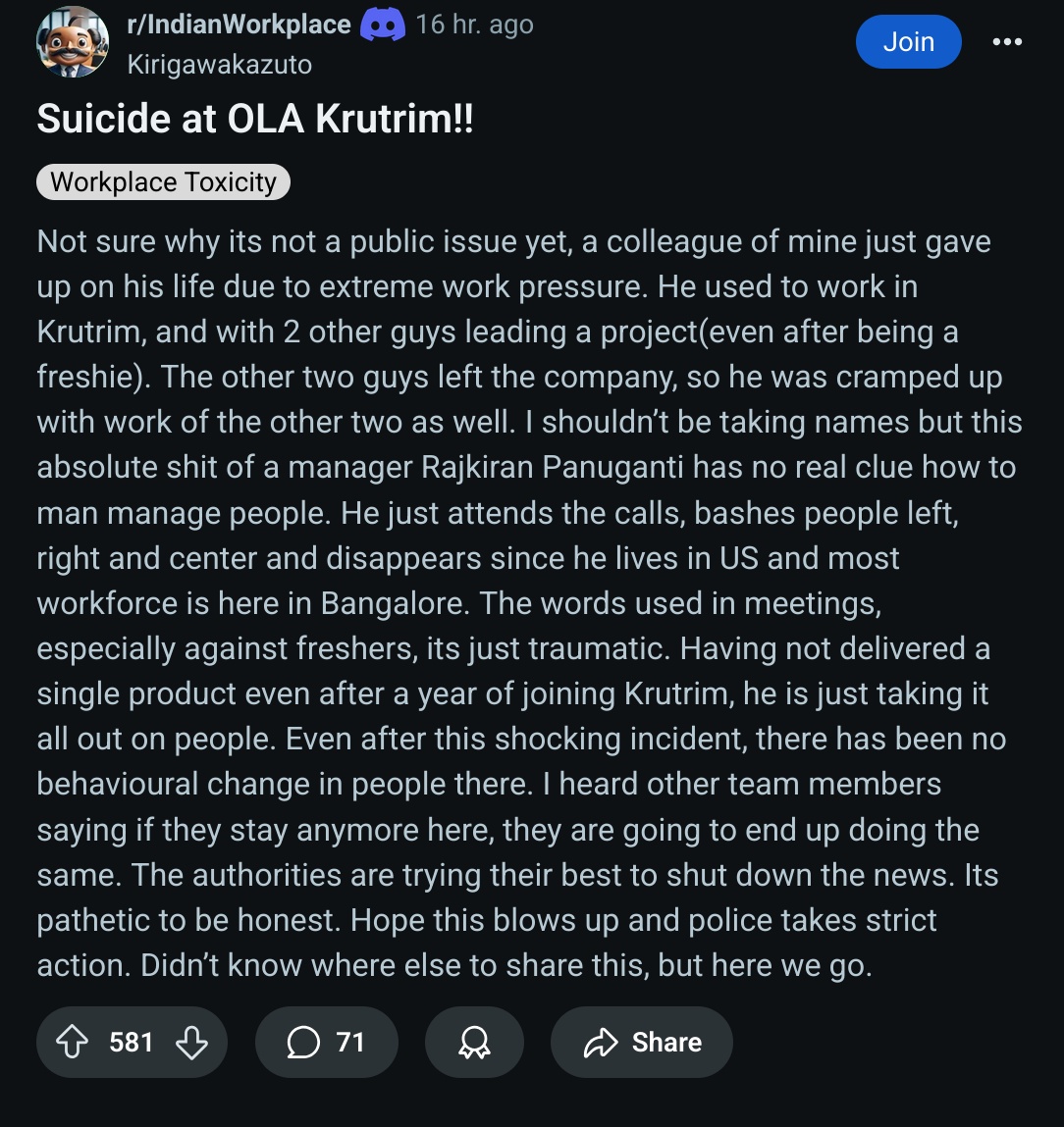 Someone committed suicide in OLA due to work pressure. This toxic work culture needs to be called out.