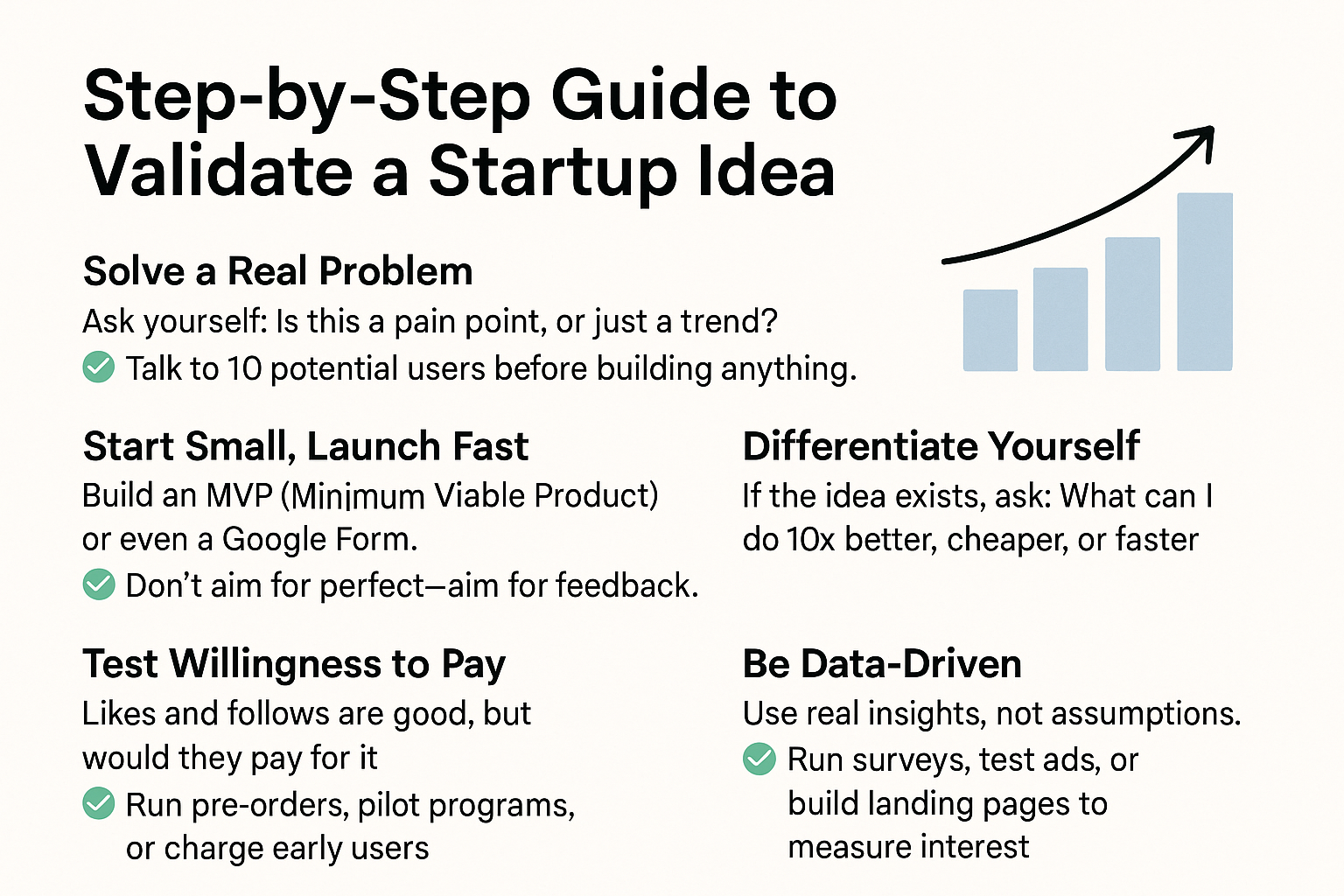 🔍 Step-by-Step Guide to Validate a Startup Idea: Solve a Real Problem Ask yourself: Is this a pain point, or just a trend? ✅ Talk to 10 potential users before building anything. Start Small, Launch Fast Build an MVP (Minimum Viable Product) or even a Google Form. ✅ Don’t aim for perfect—aim for feedback. Test Willingness to Pay Likes and follows are good, but would they pay for it? ✅ Run pre-orders, pilot programs, or charge early users. Differentiate Yourself If the idea exists, ask: What can I do 10x better, cheaper, or faster? Be Data-Driven Use real insights, not assumptions. ✅ Run surveys, test ads, or build landing pages to measure interest. 🧠 Summary with Real Example: 📌 Example – Ankur Warikoo's Online Course Business Instead of jumping into the crowded online course market blindly, Ankur Warikoo validated his idea by: Identifying a real problem: Young people lacked clarity in personal finance, productivity, and career planning. Launching fast: Created a simple MVP (video course) using Kajabi with minimal setup. Testing willingness to pay: Priced early courses affordably and got thousands of paid users. Differentiating: Added value through personal storytelling, not just information. Using data: Improved future content based on feedback, email metrics, and surveys. 🎯 Result: Over ₹3 Crore in revenue within 18 months — built without any funding, just pure validation and execution.