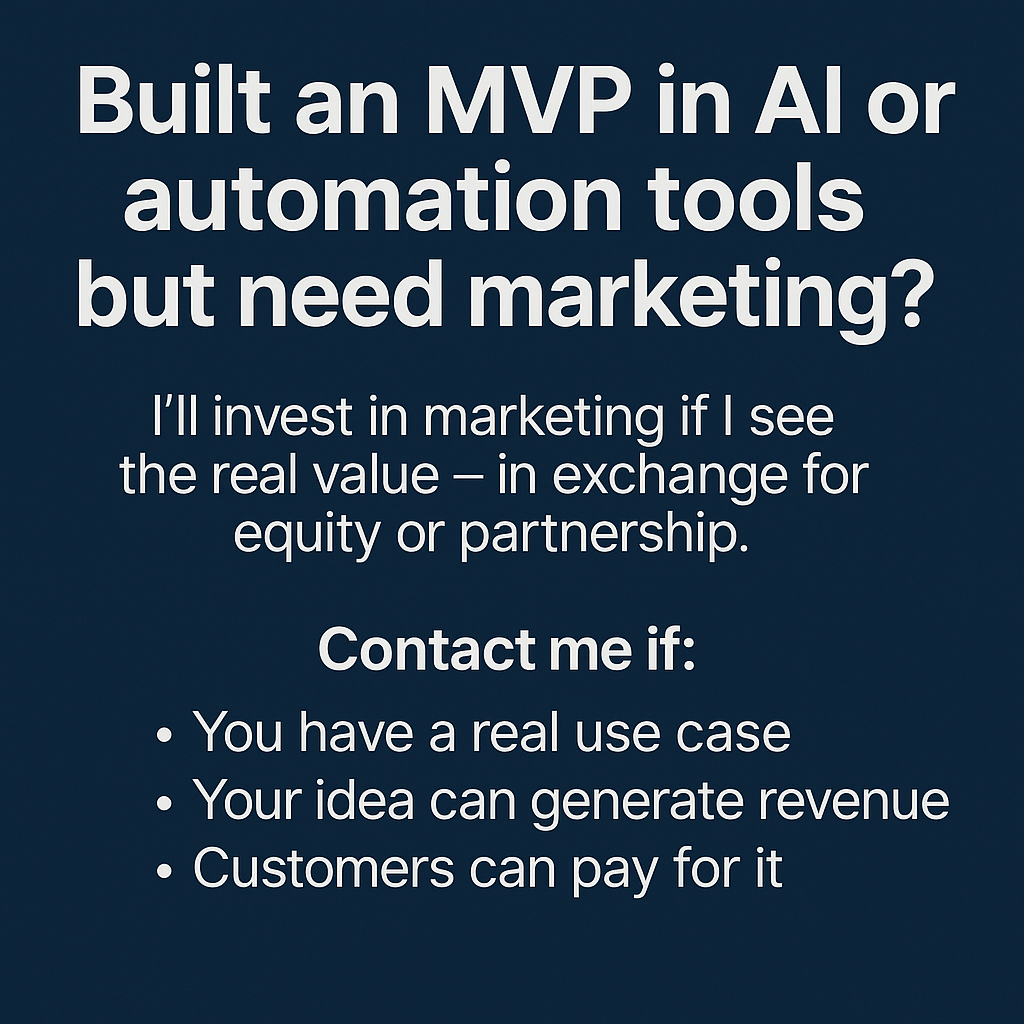 If you’ve built a solid MVP in AI, automation, or productivity tools… And your product works, solves a real pain point, and just needs eyeballs to scale… Let's collaborate 👉 I’m ready to invest in marketing — in exchange for equity or a revenue-s