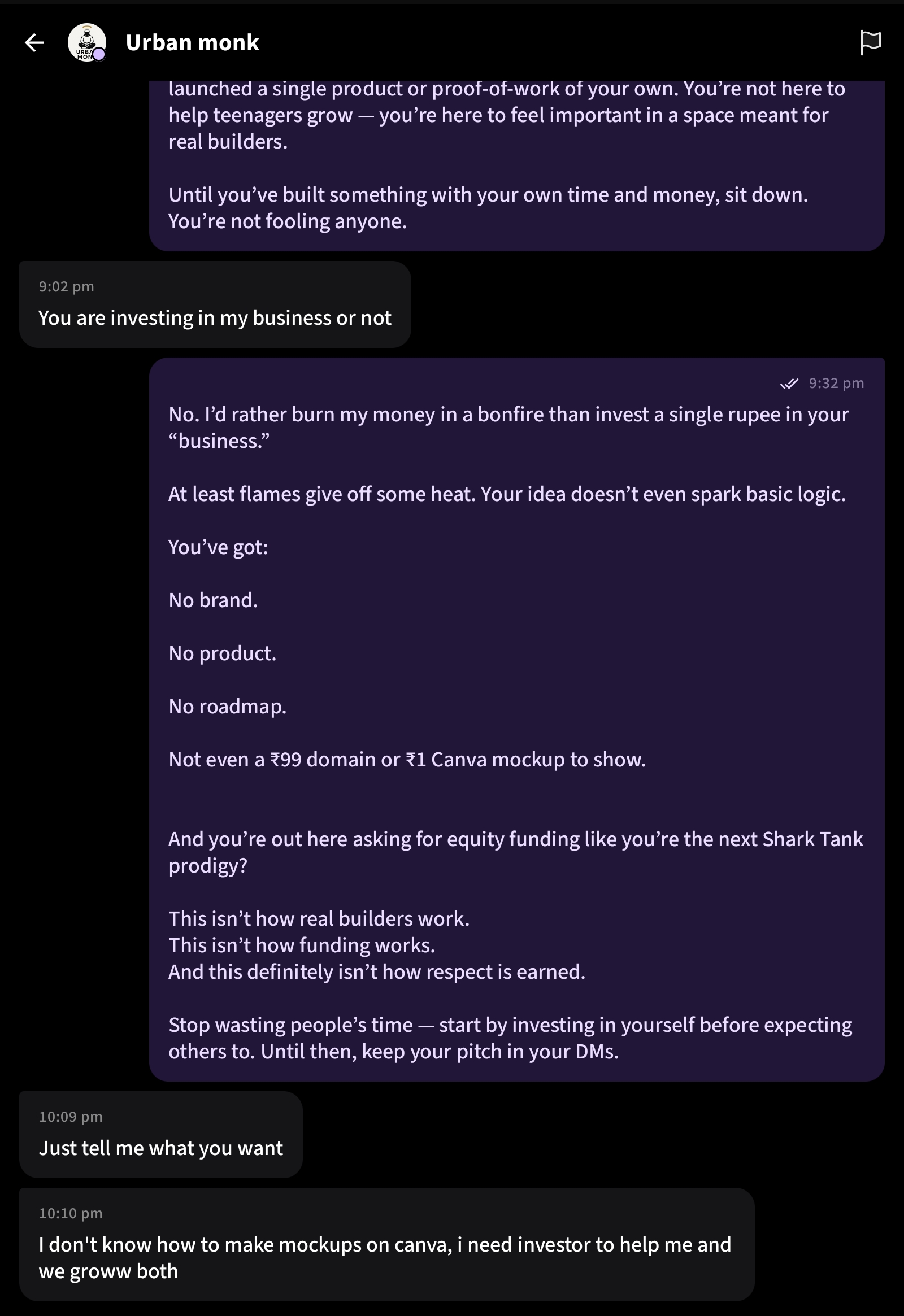 This is the truth. You're a newbie with no business, no money, and no clue how startups actually work. Stop spamming people pretending to be an “investor” when you can’t even make a mockup or buy a ₹99 domain. Building is hard. LARPing as a founder is easy. This isn’t hustle — it’s noise.